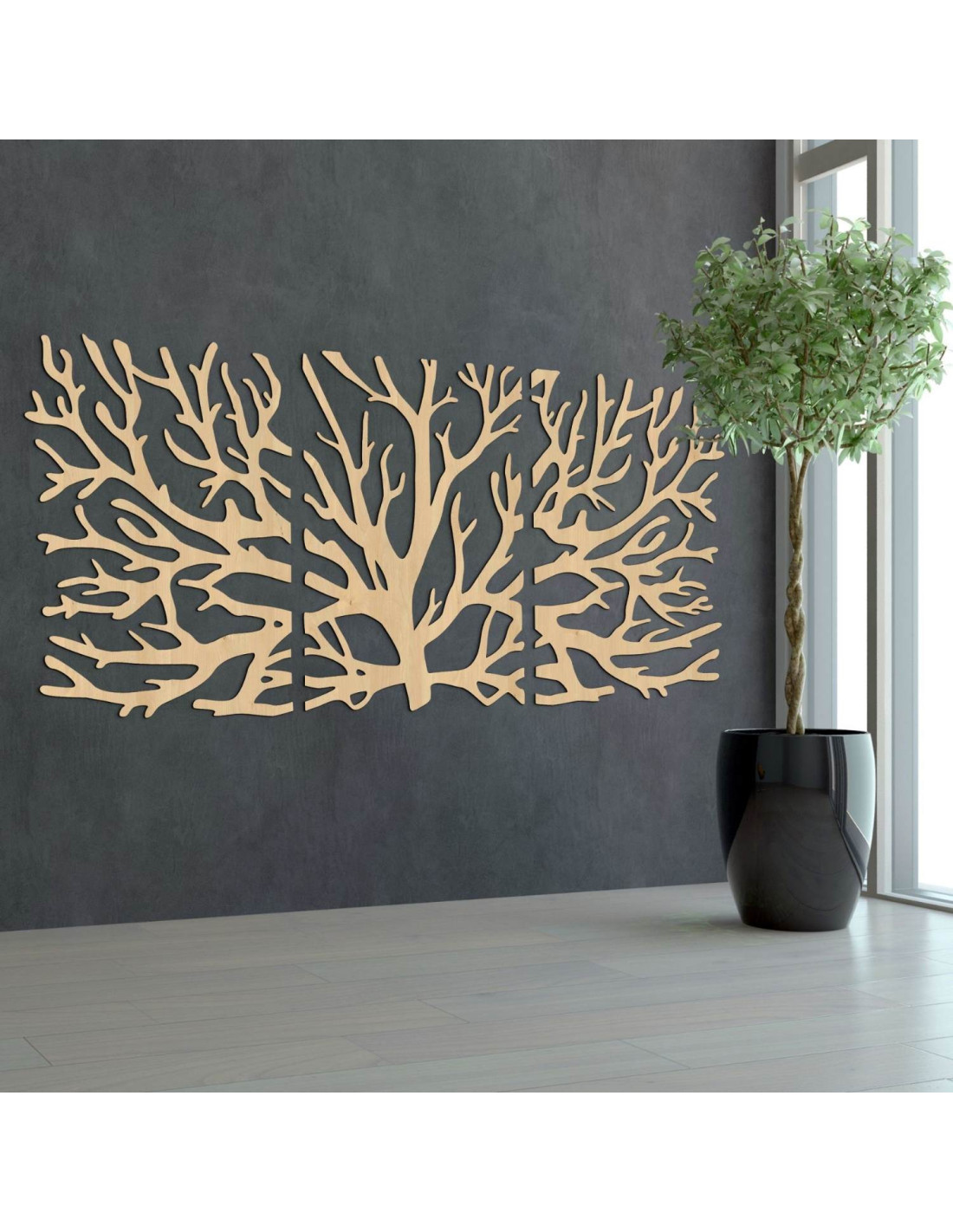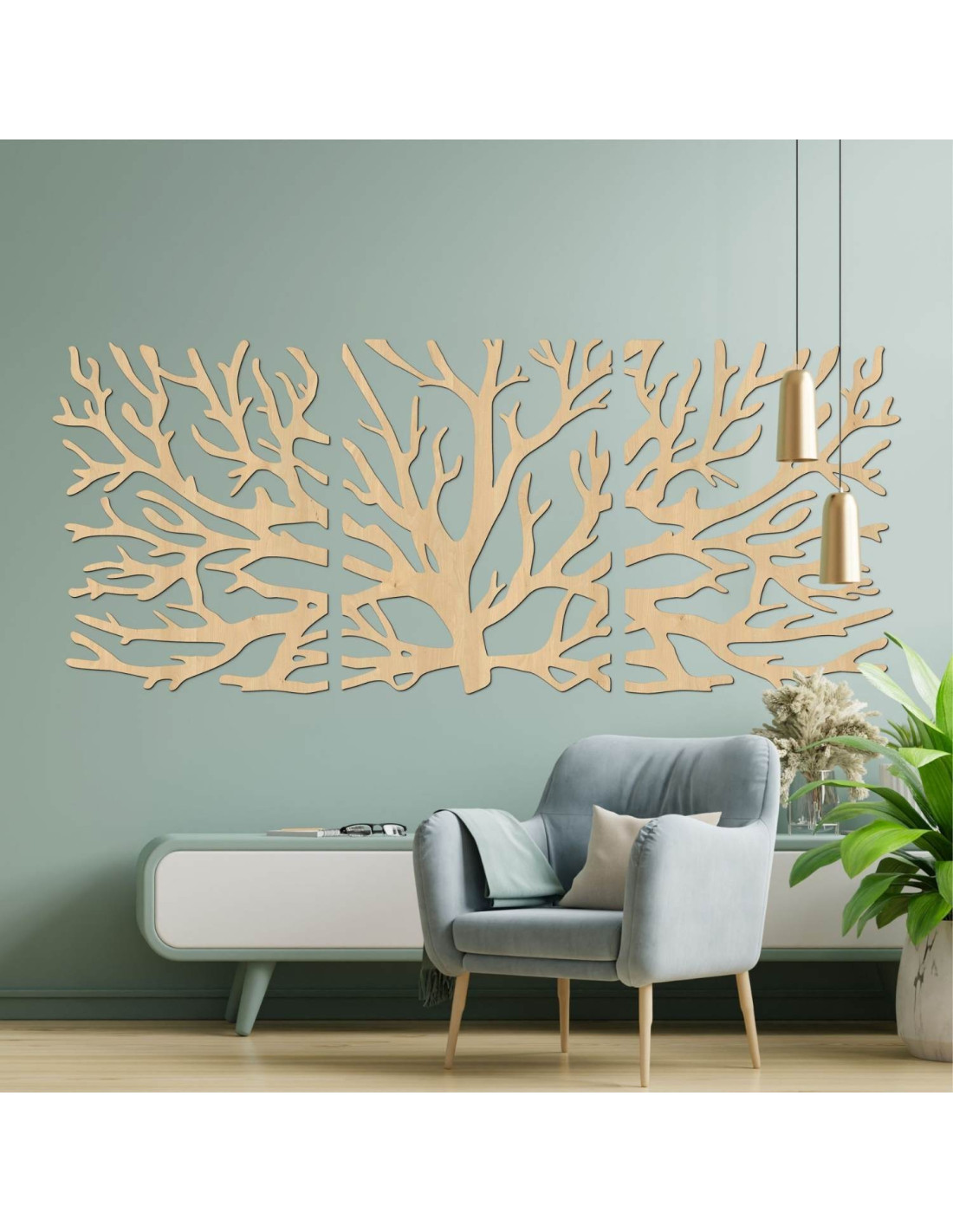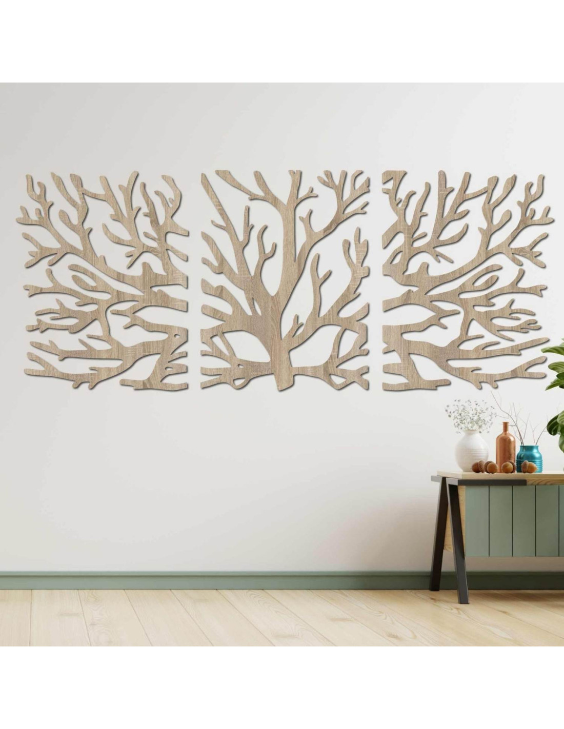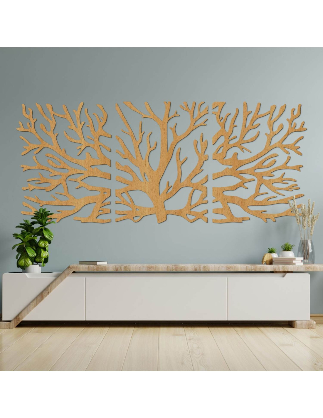 Entdecken Sie ein dreiteiliges Holzbild mit dem Motiv des Lebensbaums – eine harmonische Kombination aus modernem Design , natürlicher Symbolik und künstlerischer Eleganz , die Ihrem Interieur einen einzigartigen Charakter verleiht.