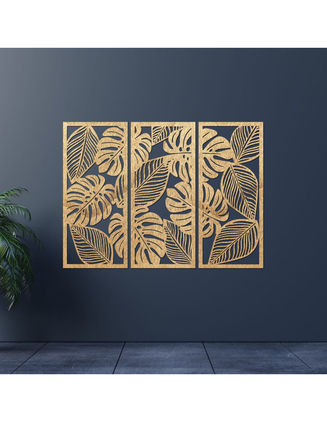 Dreiteiliges dekoratives Wandpaneel mit tropischem Blattmotiv.