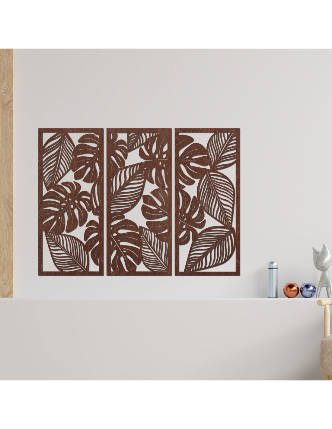 Dreiteiliges Holzbild mit geschnitzter Monstera und exotischen Blättern.