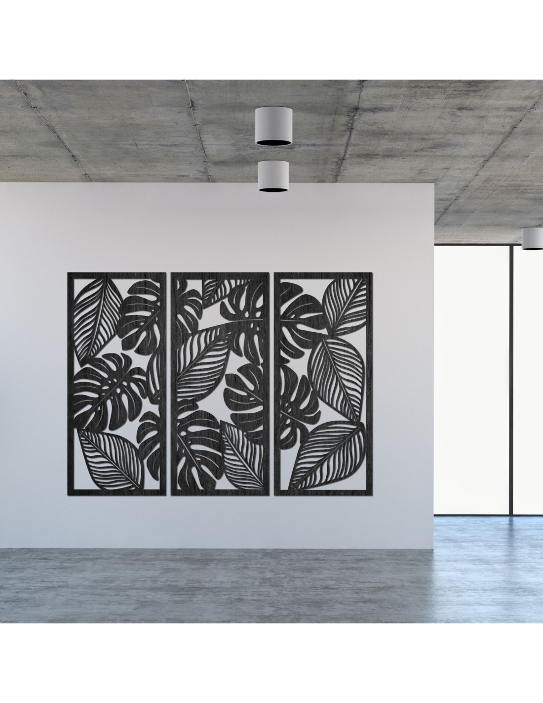 Moderne Wanddekoration: drei Paneele mit Ausschnitten von Monstera-Blättern.