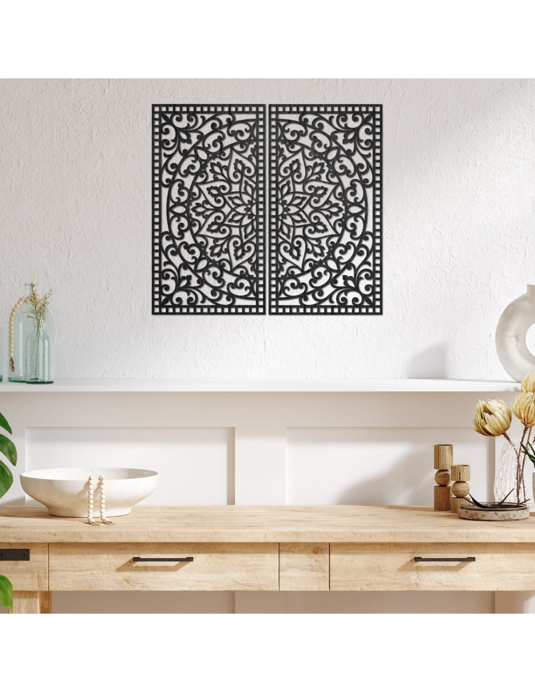 Hölzernes 3D-Mandala an der Wand – Geschnitztes Diptychon im Boho-Stil