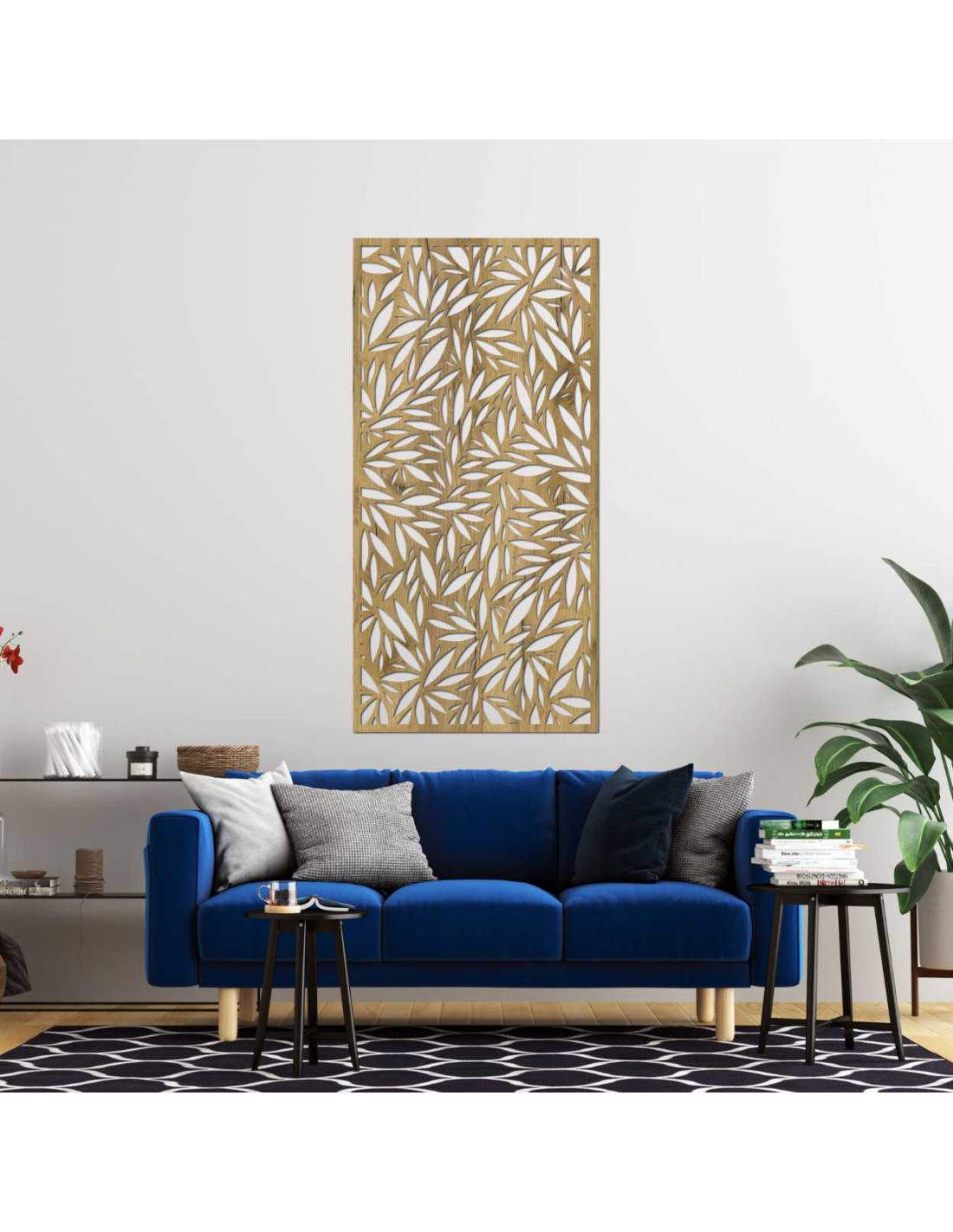 Dekoratives Paneel mit Blattausschnitten an einer hellen Wand