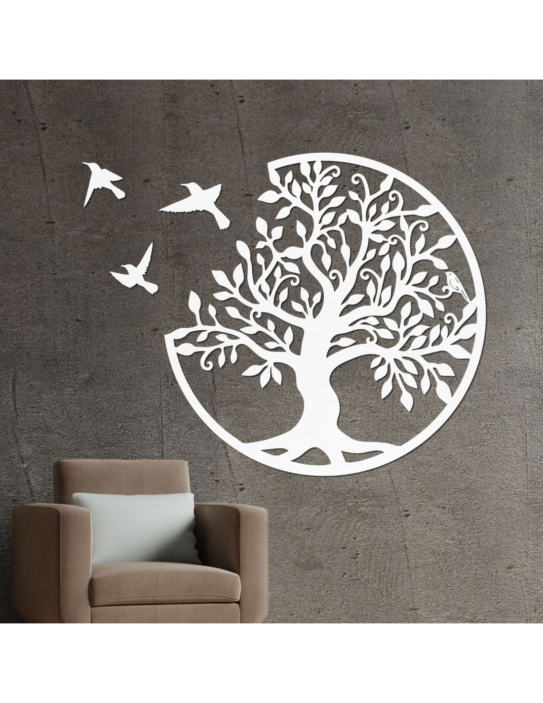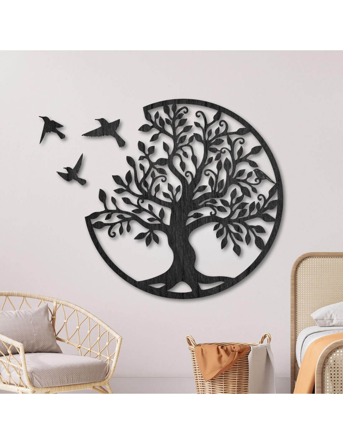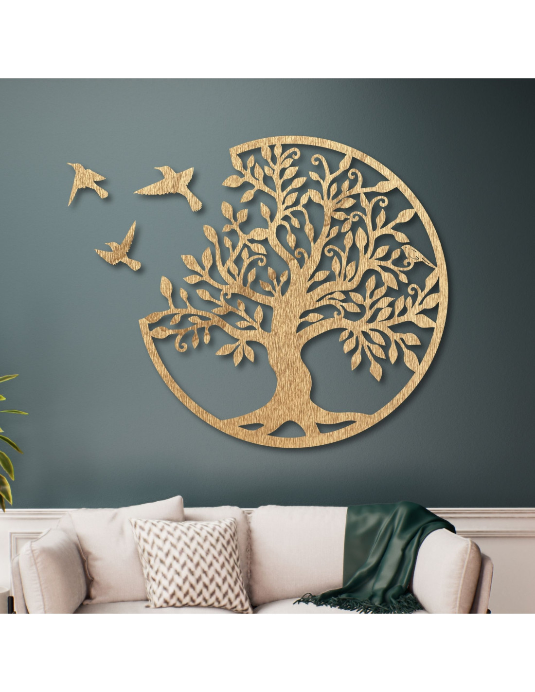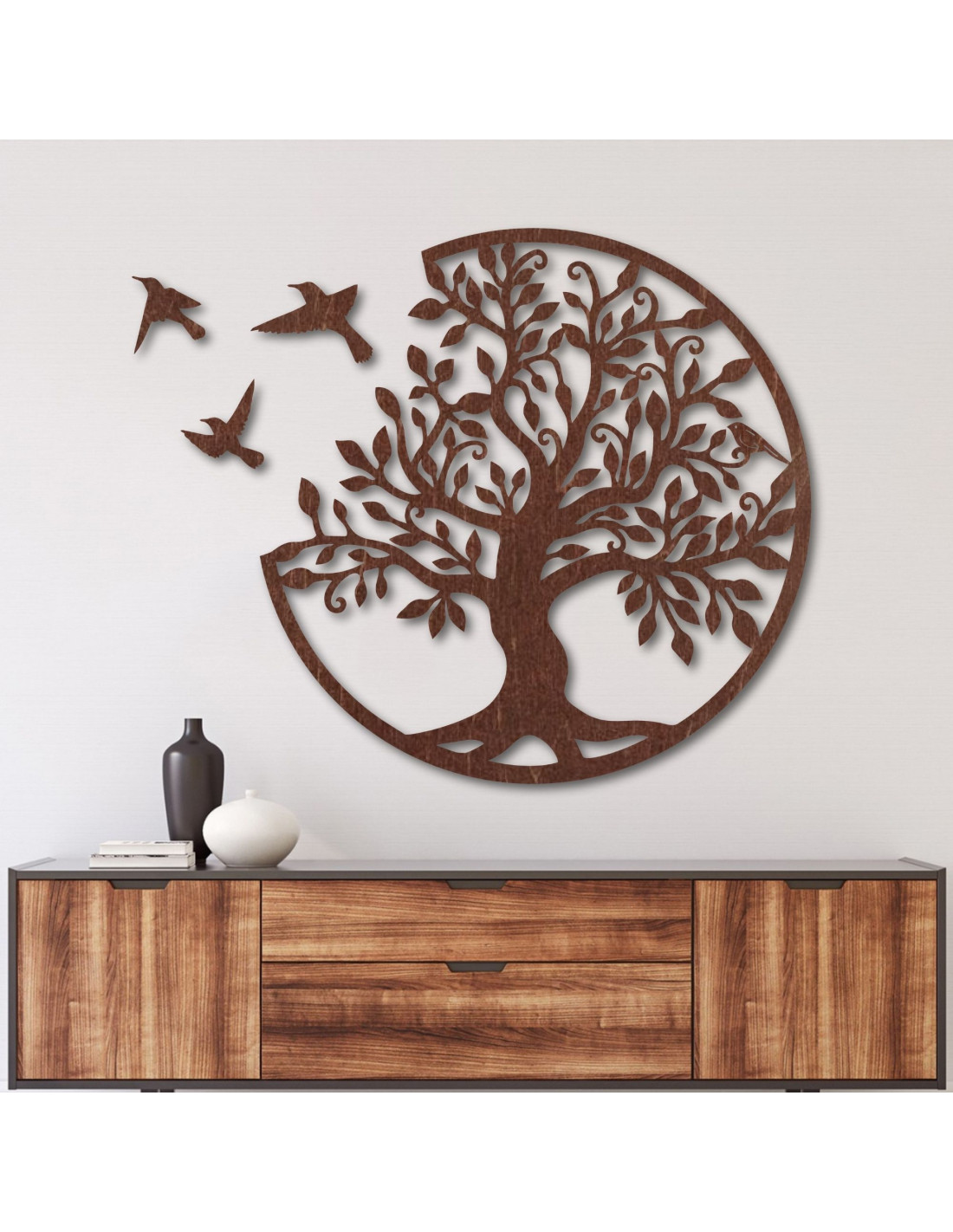 Wanddekoration aus Holz – Lebensbaum mit drei fliegenden Vögeln