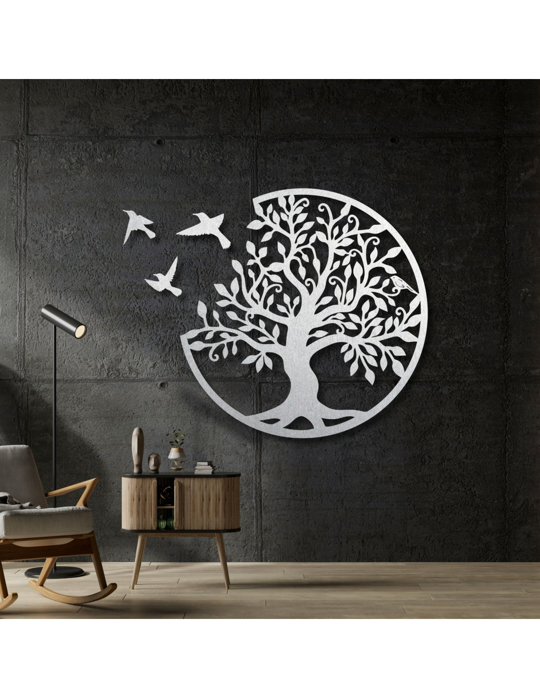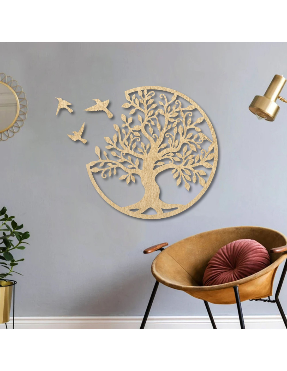 Entdecken Sie ein einzigartiges Holzgemälde des Lebensbaums mit drei eleganten fliegenden Vögeln, das natürliche Harmonie, Eleganz und modernes Design vereint.