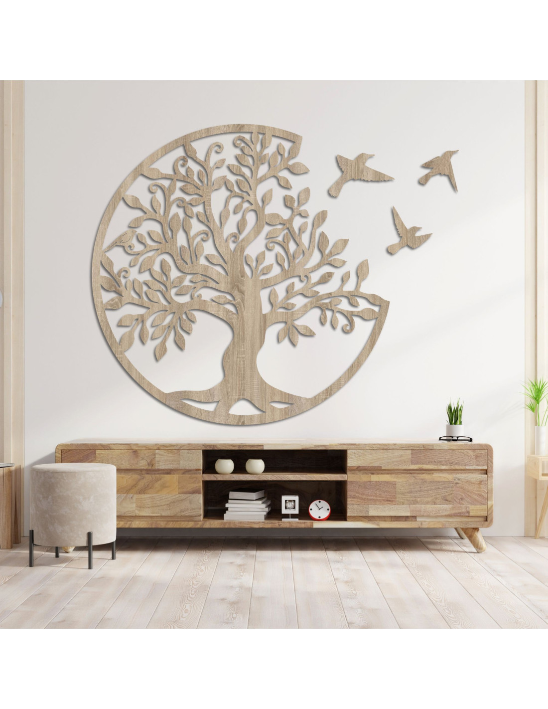 Holzbild – Lebensbaum mit 3 fliegenden Vögeln ist ein elegantes Wandbild.