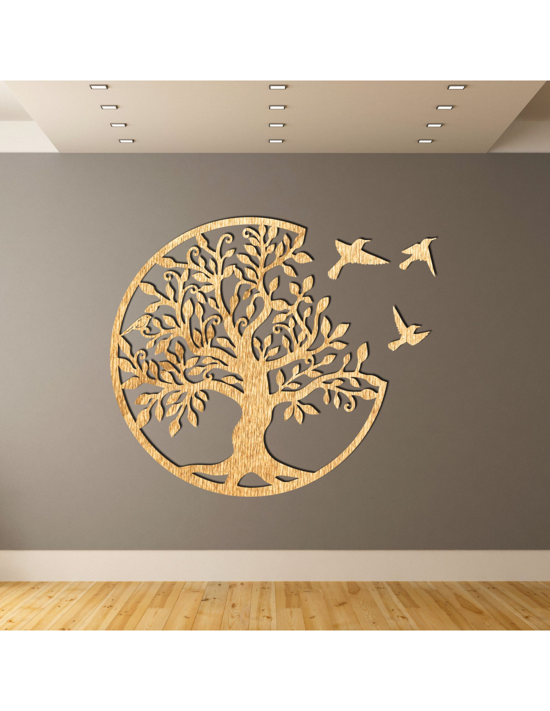 Der hölzerne Lebensbaum mit drei nach rechts fliegenden Vögeln ist eine elegante Wanddekoration, die Ihrem Interieur Stil und Harmonie verleiht.