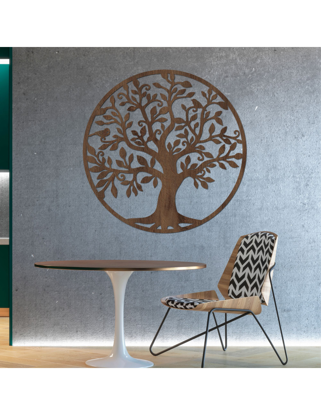 Der symbolische Lebensbaum in Holzoptik verleiht dem Zuhause einen Hauch von Natur und spiritueller Ausgewogenheit .
