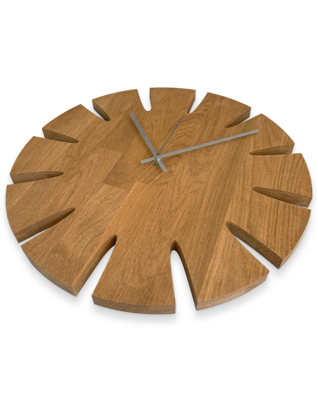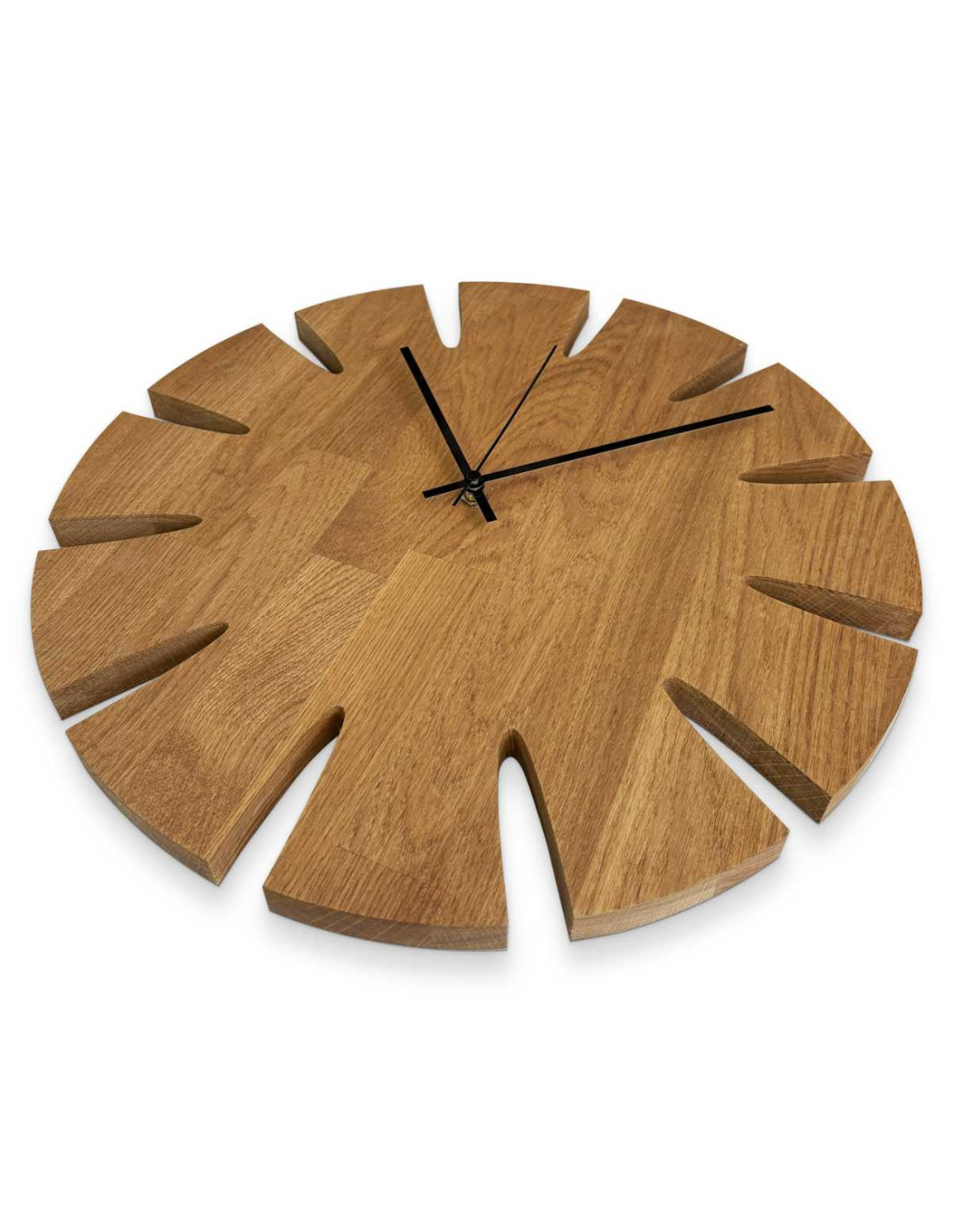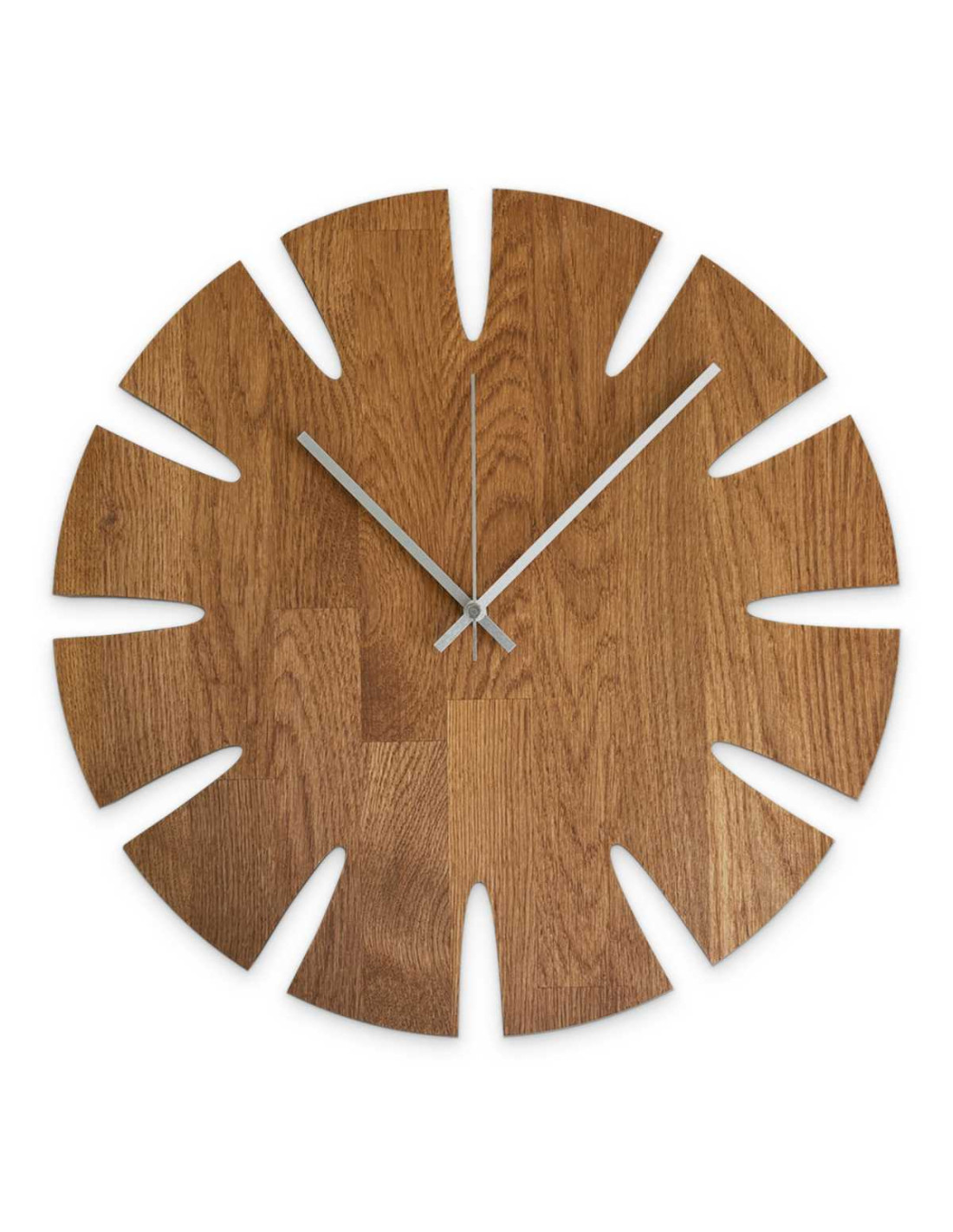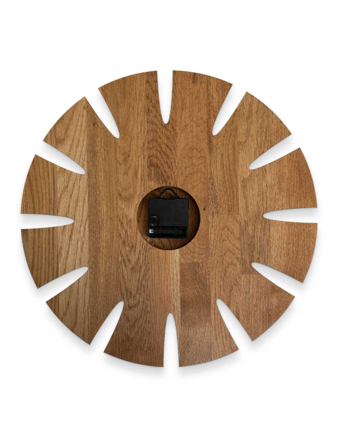 Jede Uhr wird aus massiven Eichenholzplatten gefertigt, die mithilfe von CNC-Technologie präzise zugeschnitten werden.