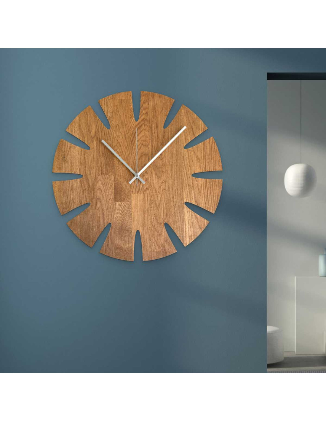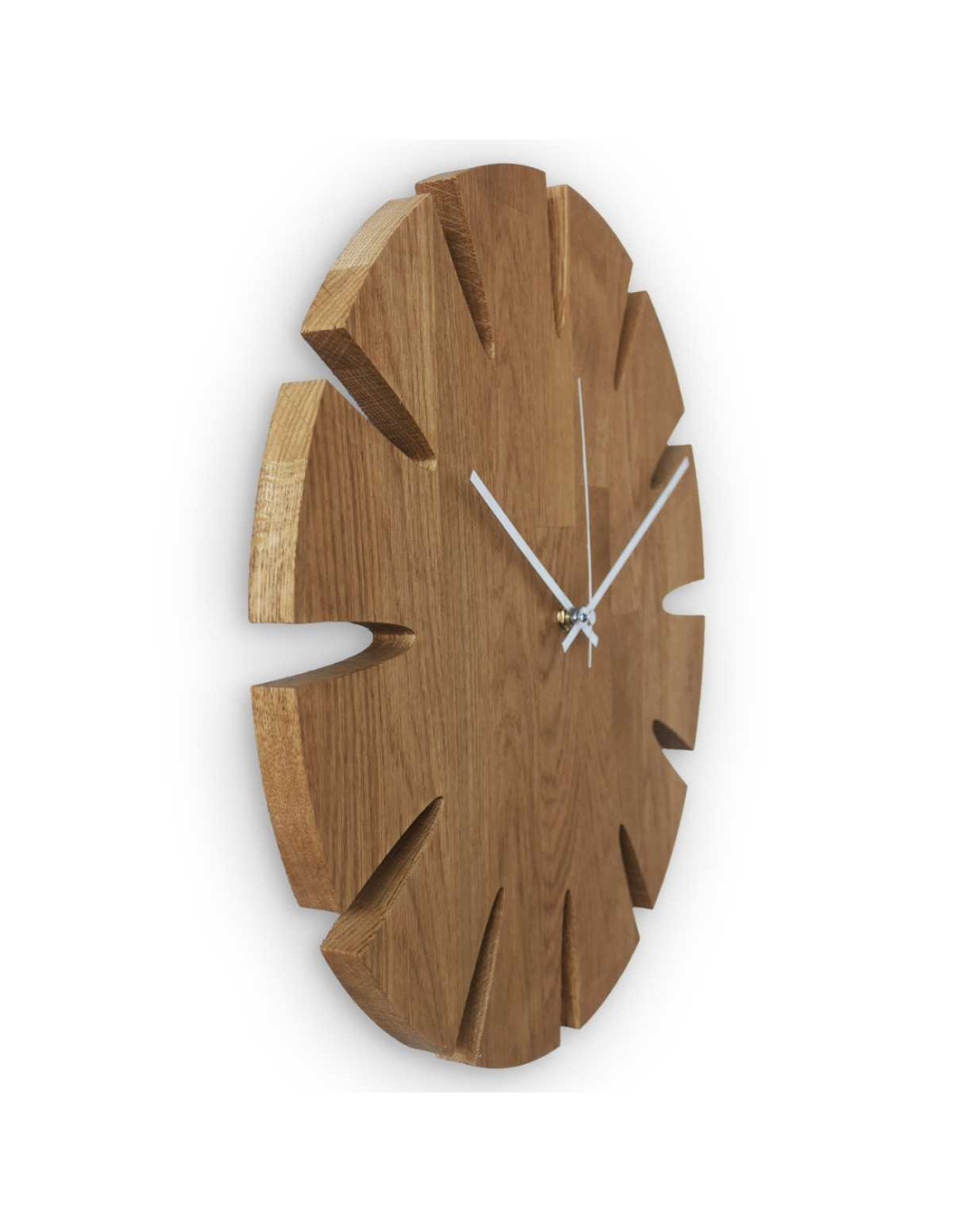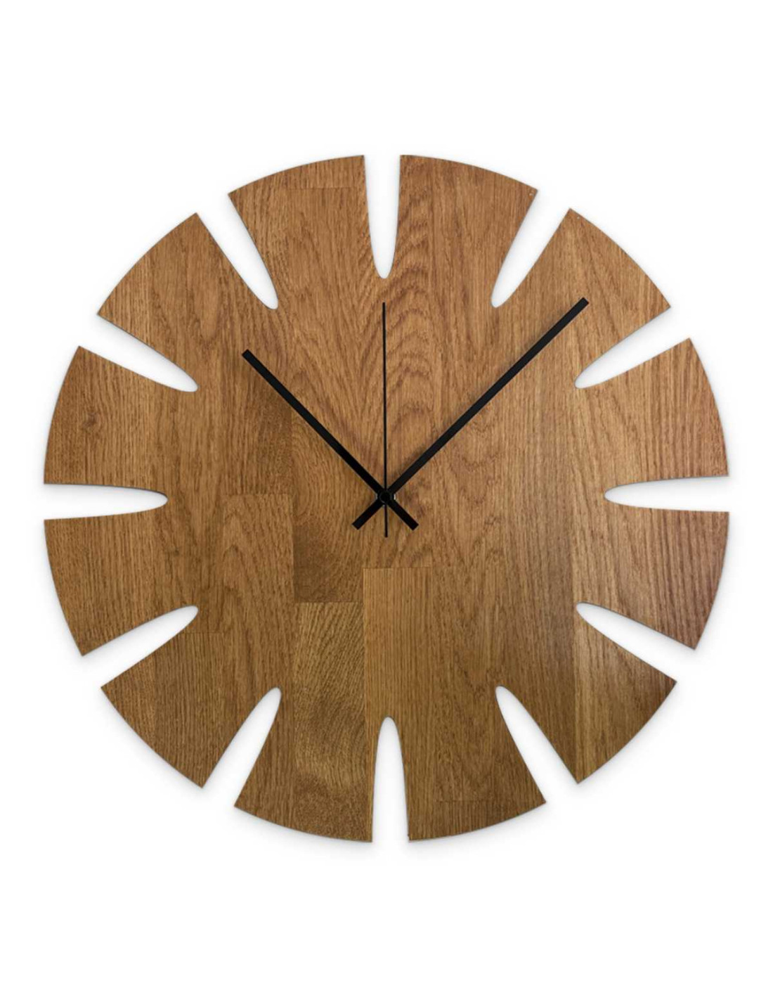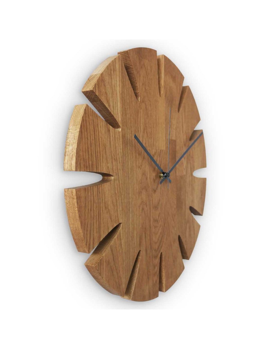 Jede Uhr wird aus massiven Eichenholzplatten gefertigt, die mithilfe von CNC-Technologie präzise zugeschnitten werden.
