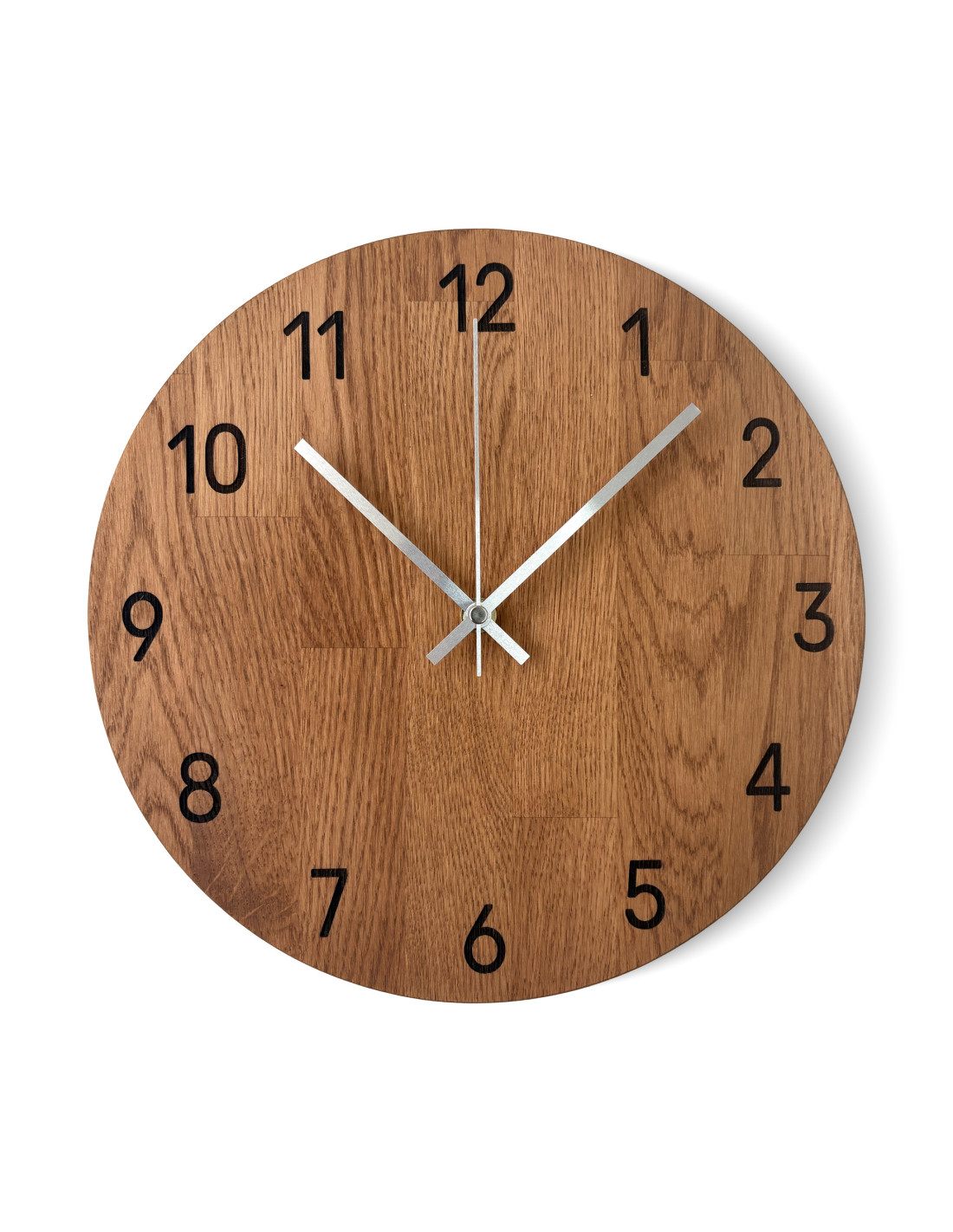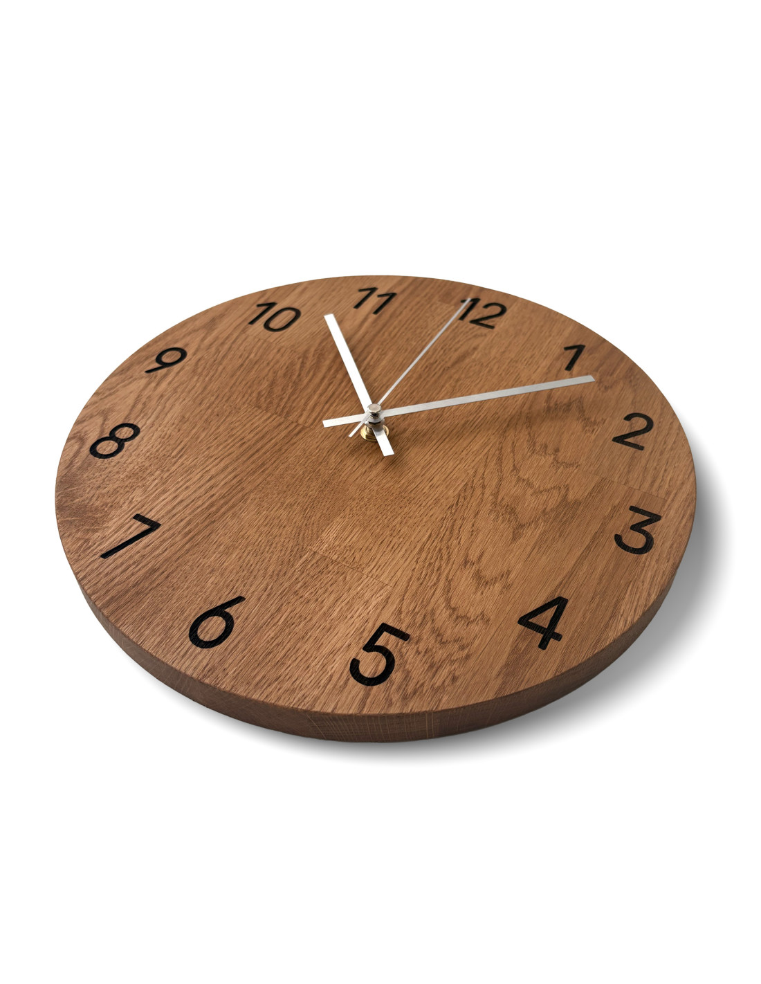 Jede Uhr wird aus massiven Eichenholzplatten hergestellt, die zunächst mithilfe von CNC-Technologie präzise in die gewünschte Form und Größe zugeschnitten werden.