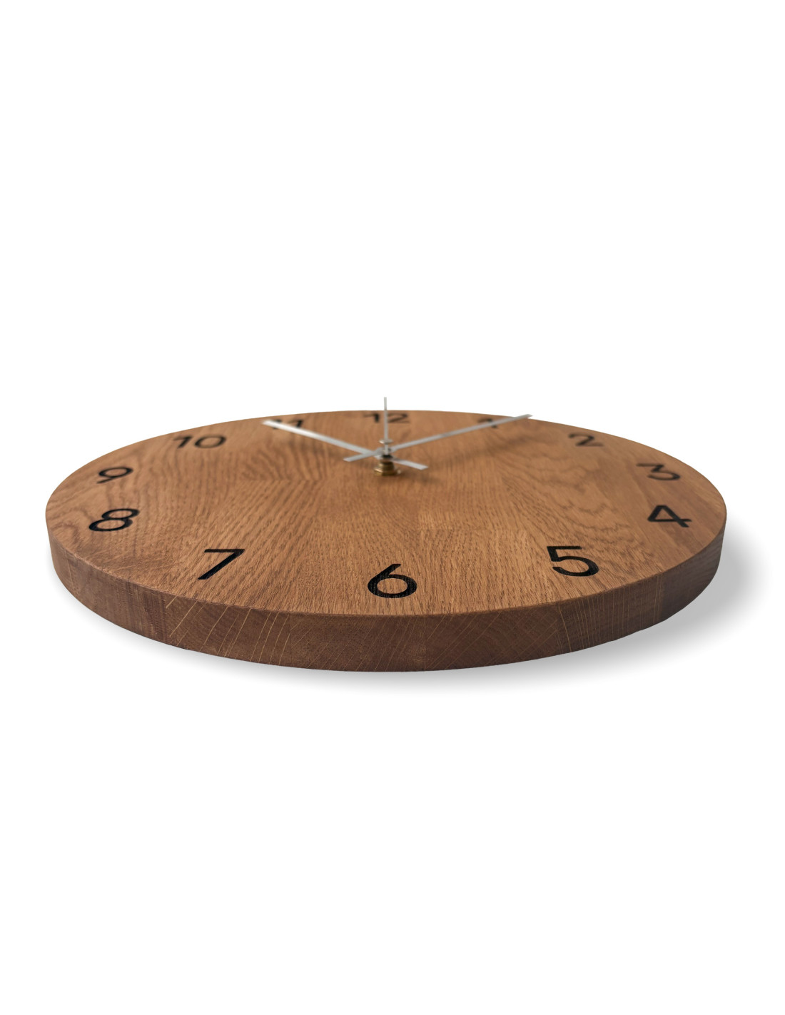 Jede Uhr wird aus massiven Eichenholzplatten hergestellt, die zunächst mithilfe von CNC-Technologie präzise in die gewünschte Form und Größe zugeschnitten werden.
