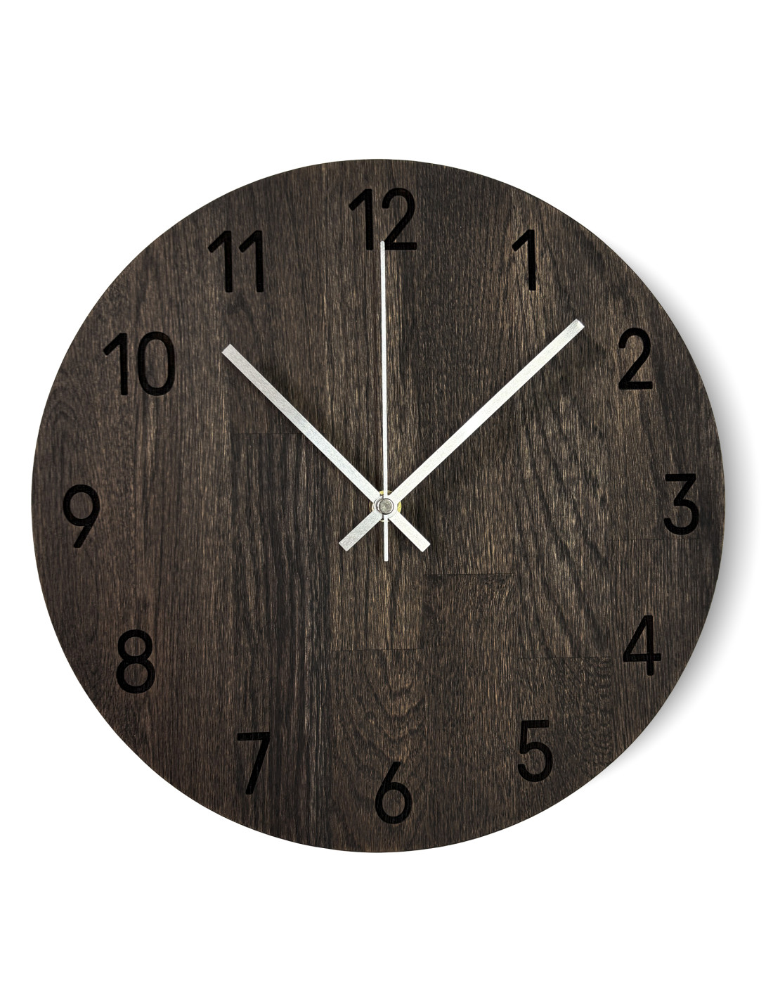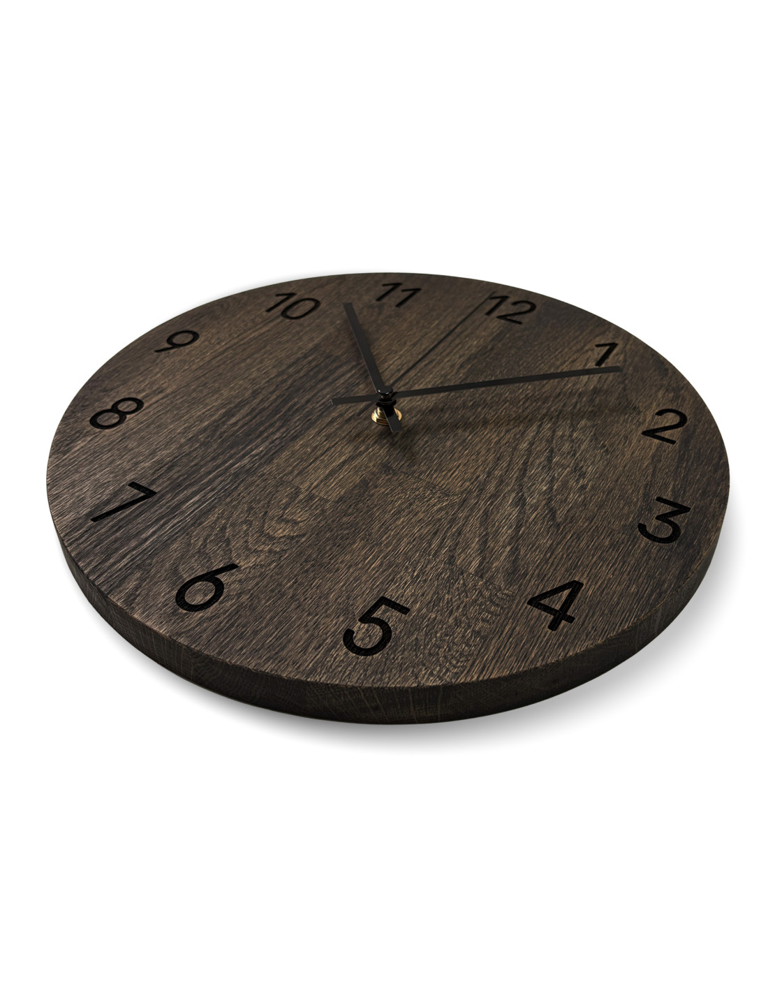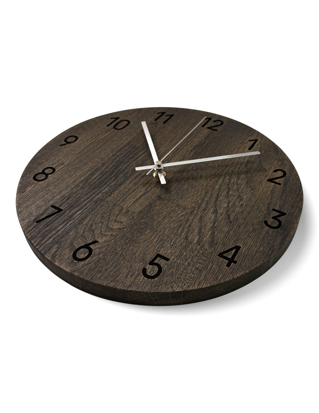 Jede Uhr besteht aus massiven Eichenplatten, die zunächst mithilfe der CNC-Technologie präzise in die gewünschte Form und Größe geschnitten werden .