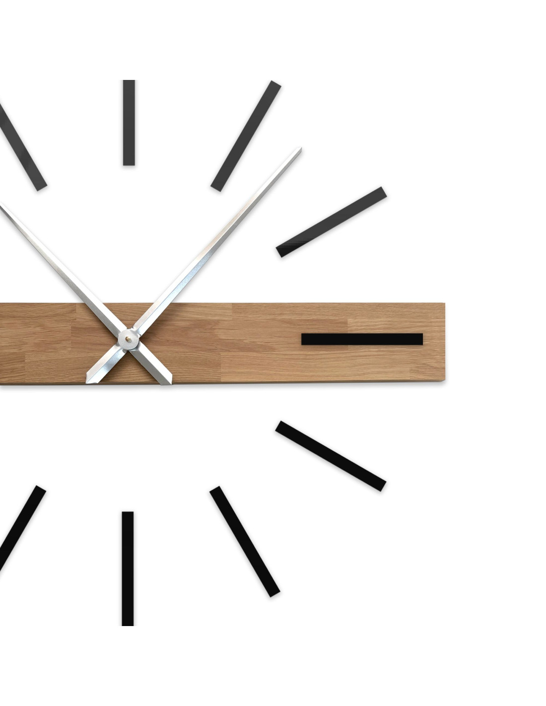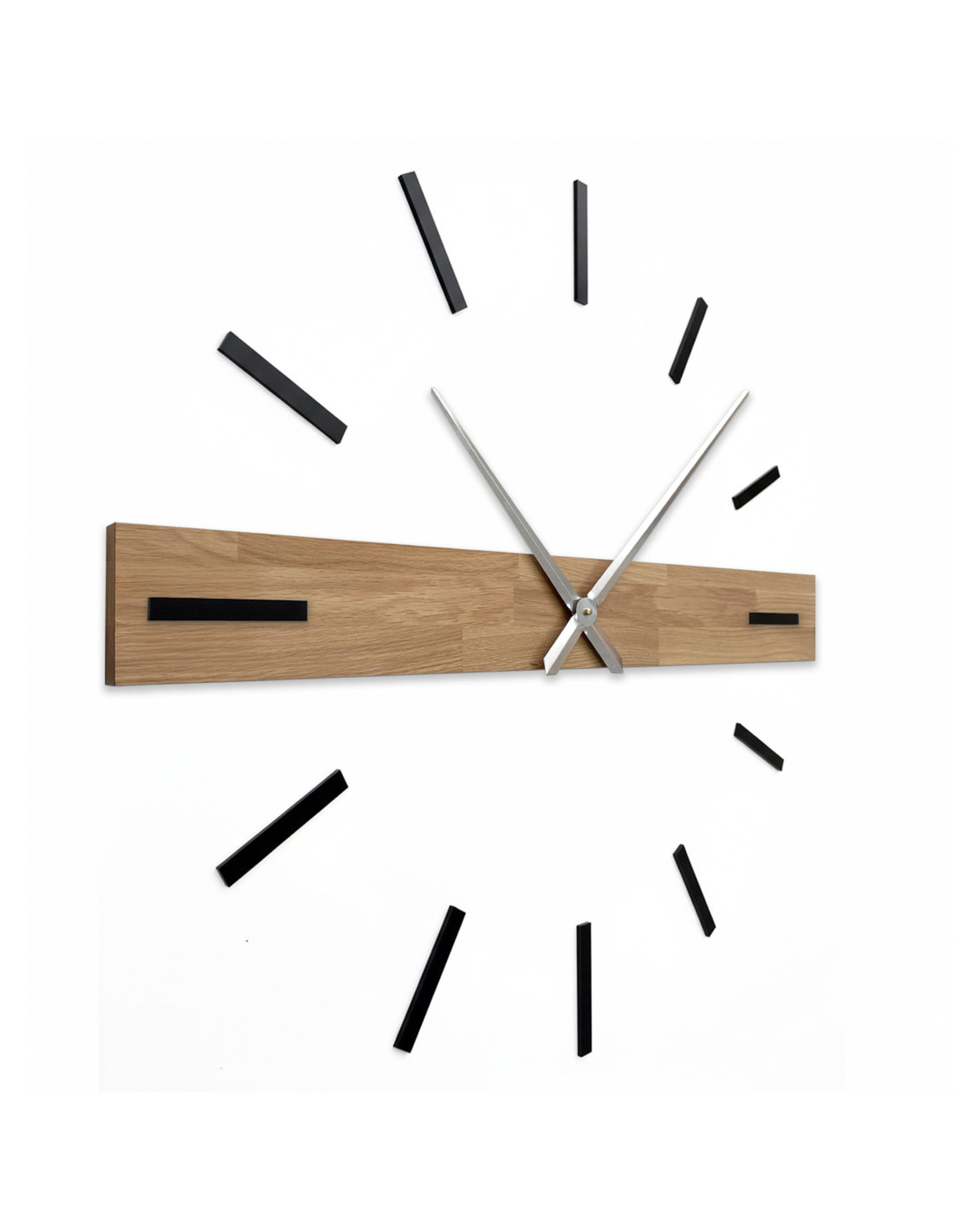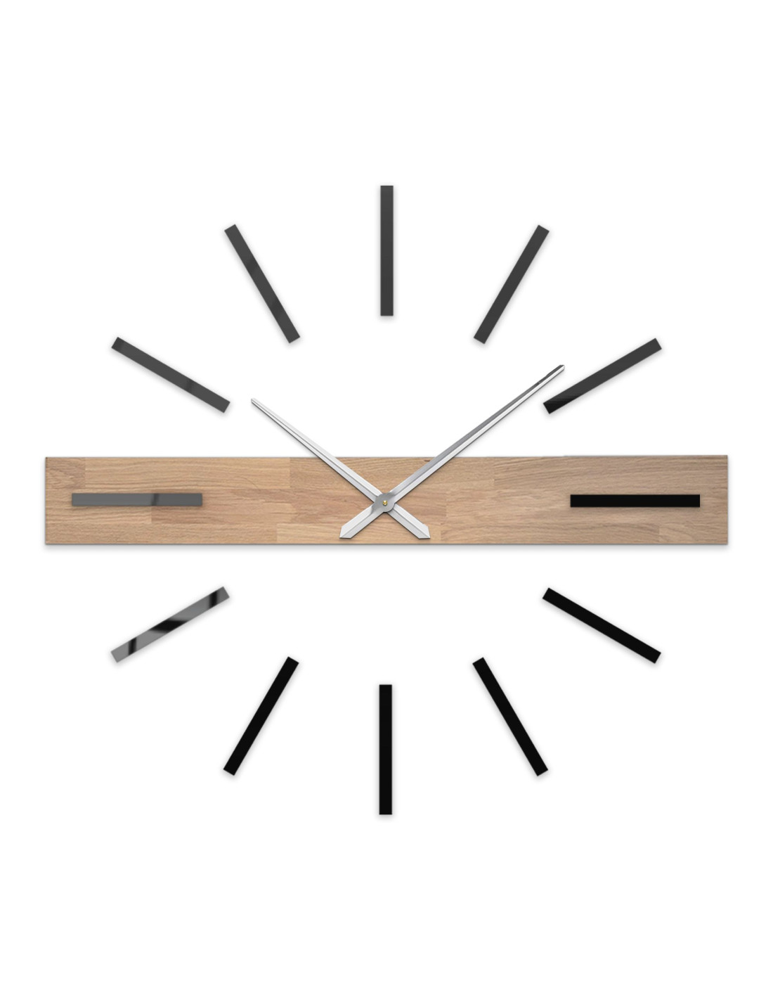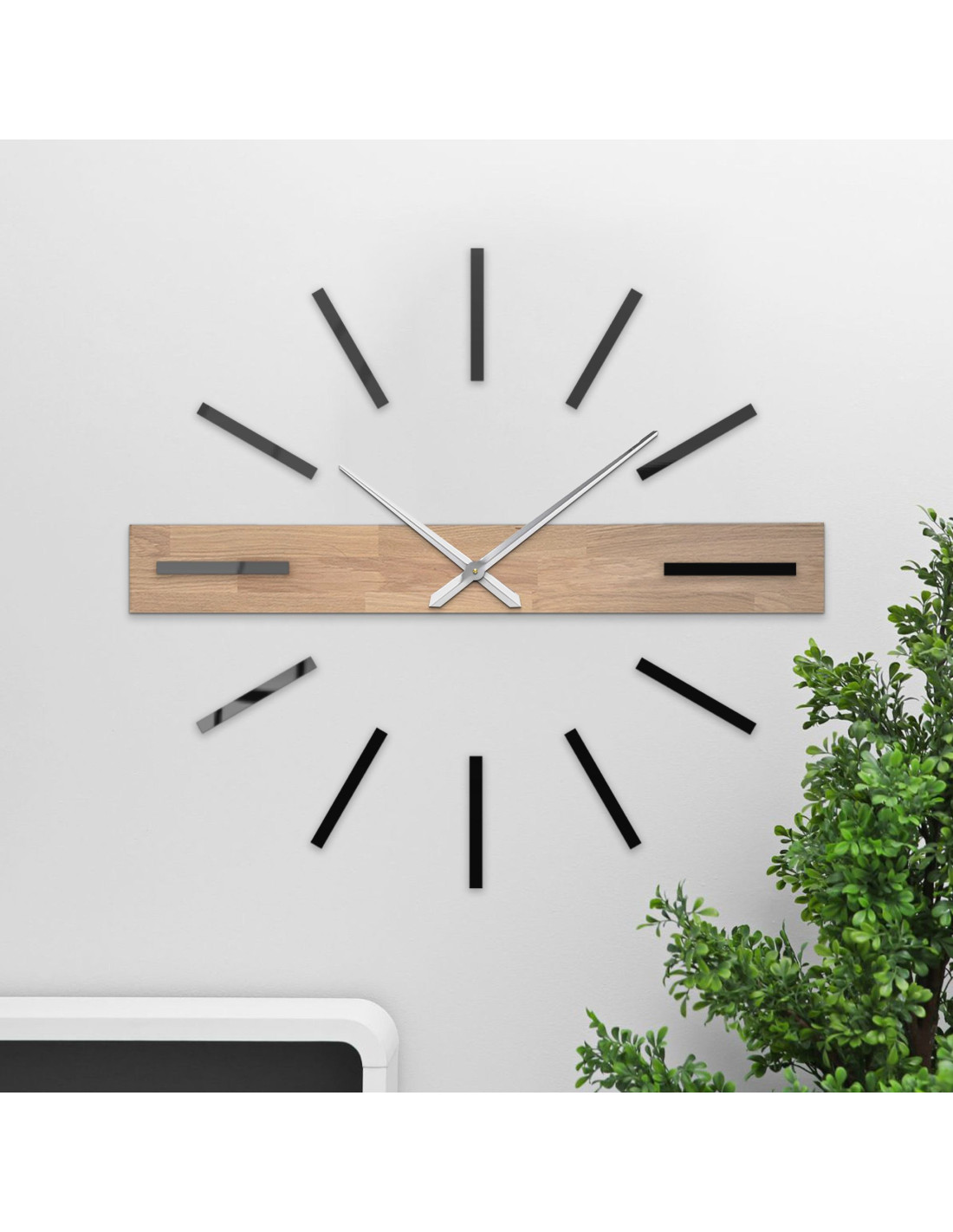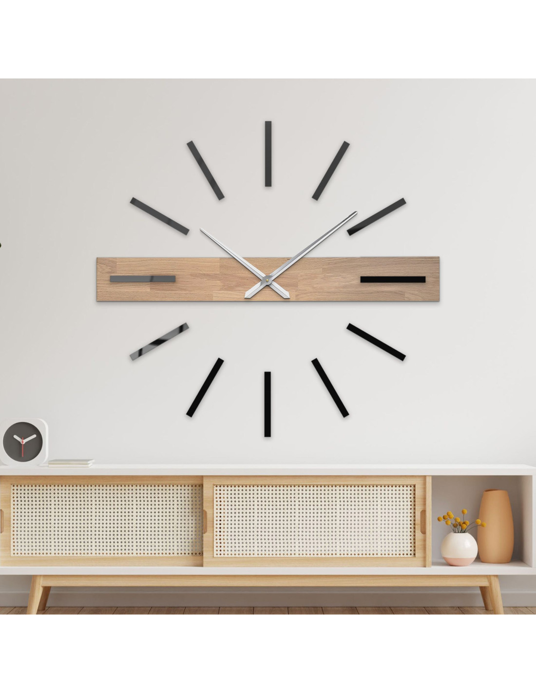 Das dominante horizontale Element aus Massivholz setzt einen originellen optischen Akzent, während die eleganten 3D-Indizes und Metallzeiger der Uhr einen luxuriösen und modernen Charakter verleihen.