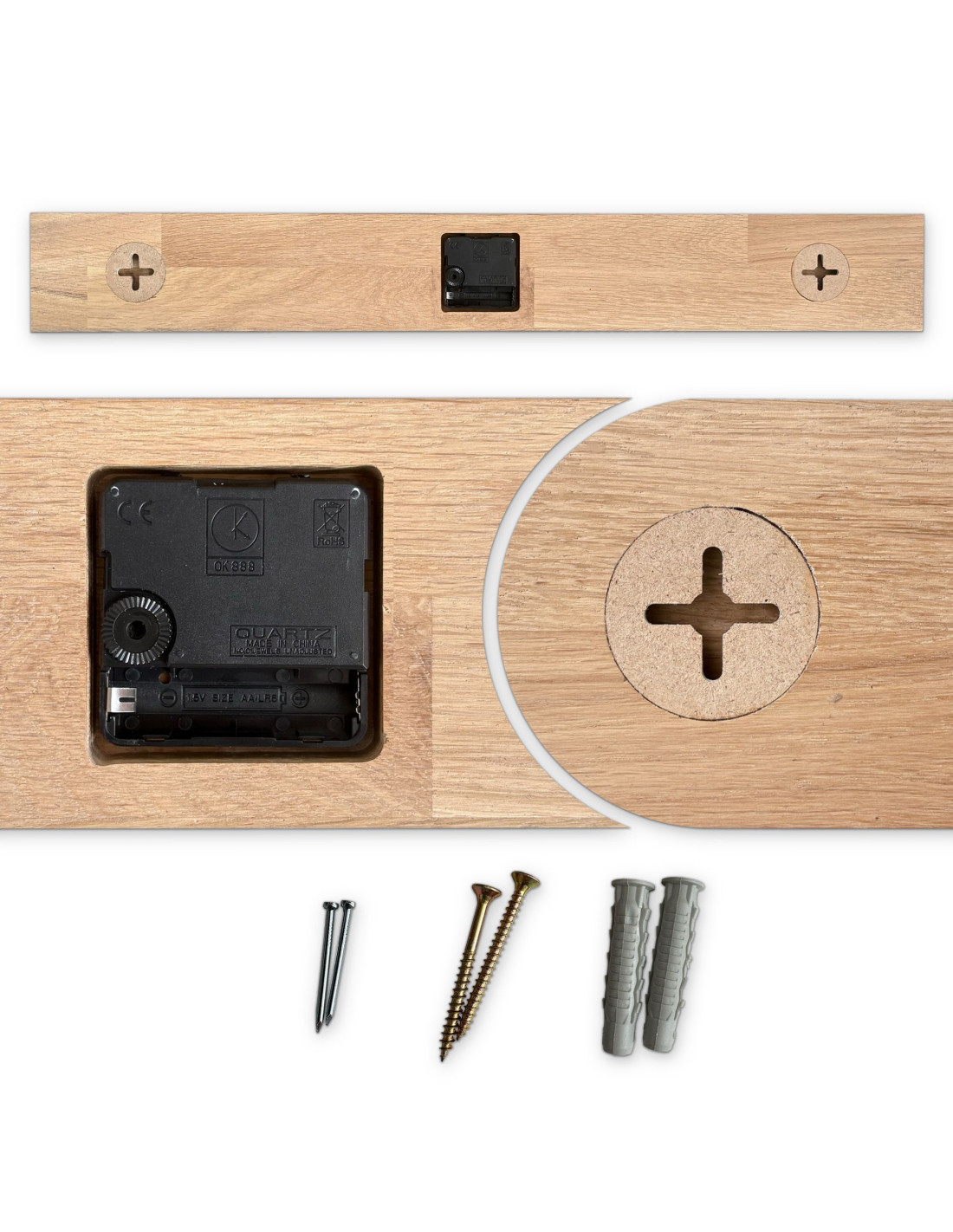 Das Paket enthält zwei Nägel, zwei Kunststoffdübel und zwei Schrauben , was eine einfache, schnelle und zuverlässige Montage der Uhr an der Wand gewährleistet.