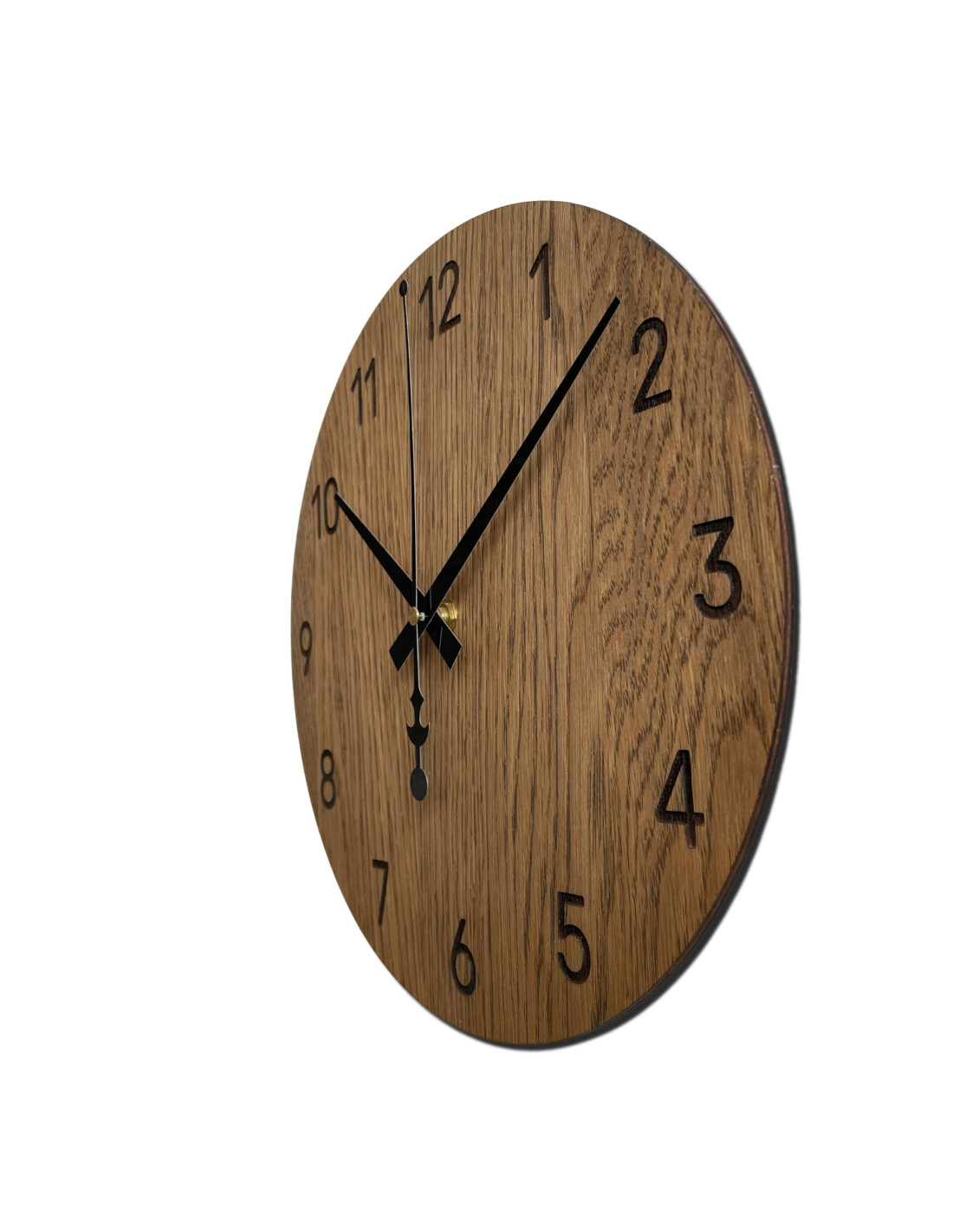 Die natürliche Schönheit des Eichenholzes in Kombination mit eleganten schwarzen Zeigern sorgt für einen dezenten und modernen Look. Die Uhr passt perfekt sowohl in rustikale als auch in minimalistische Innenräume und verleiht dem Raum ein harmonisches visuelles Element.