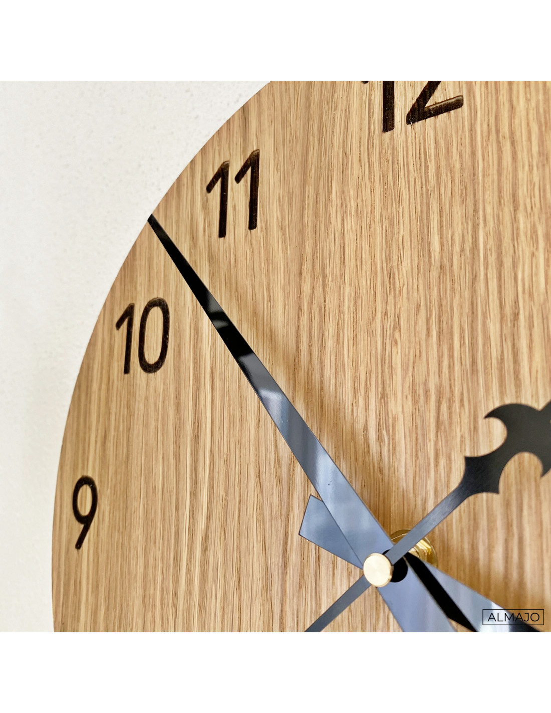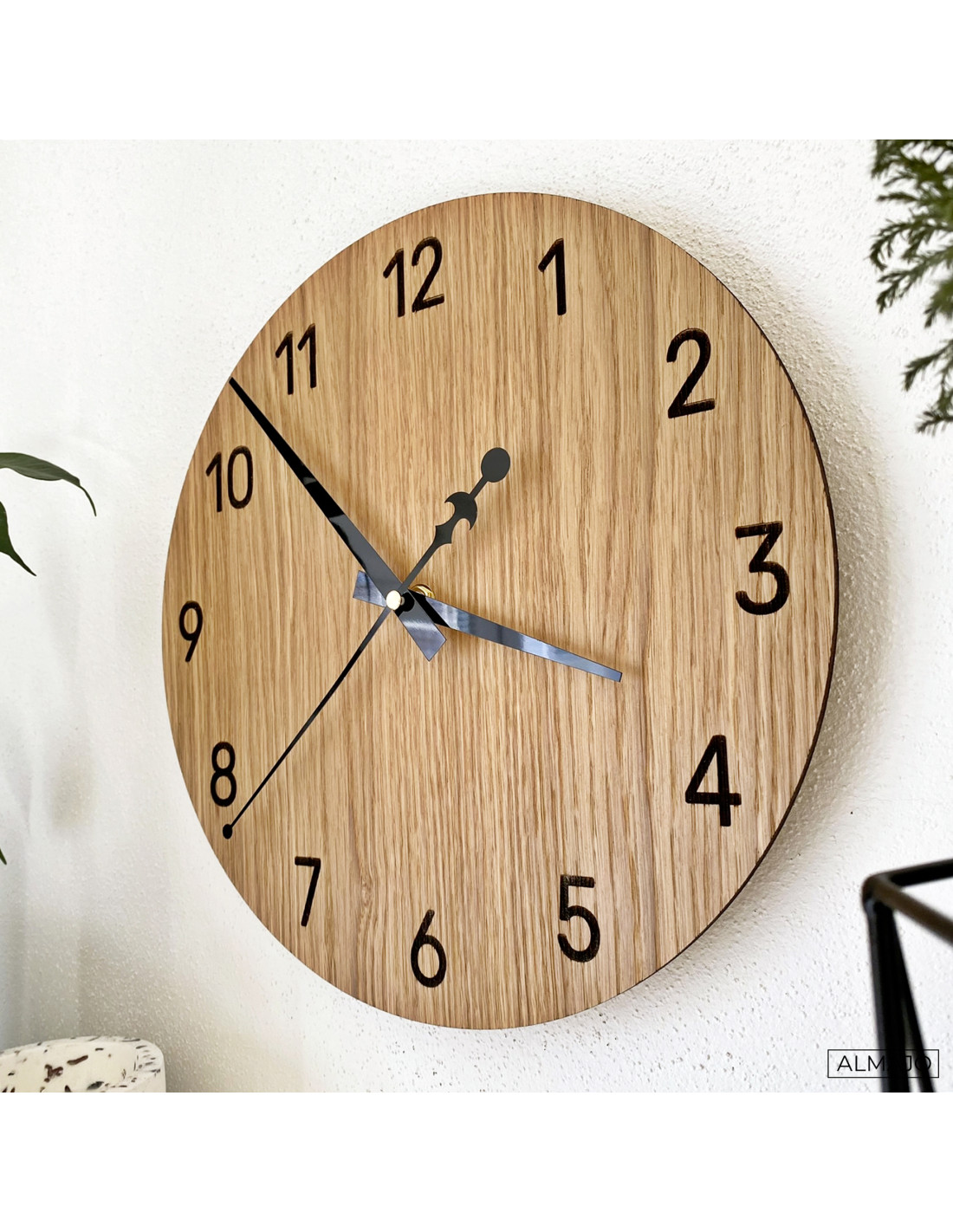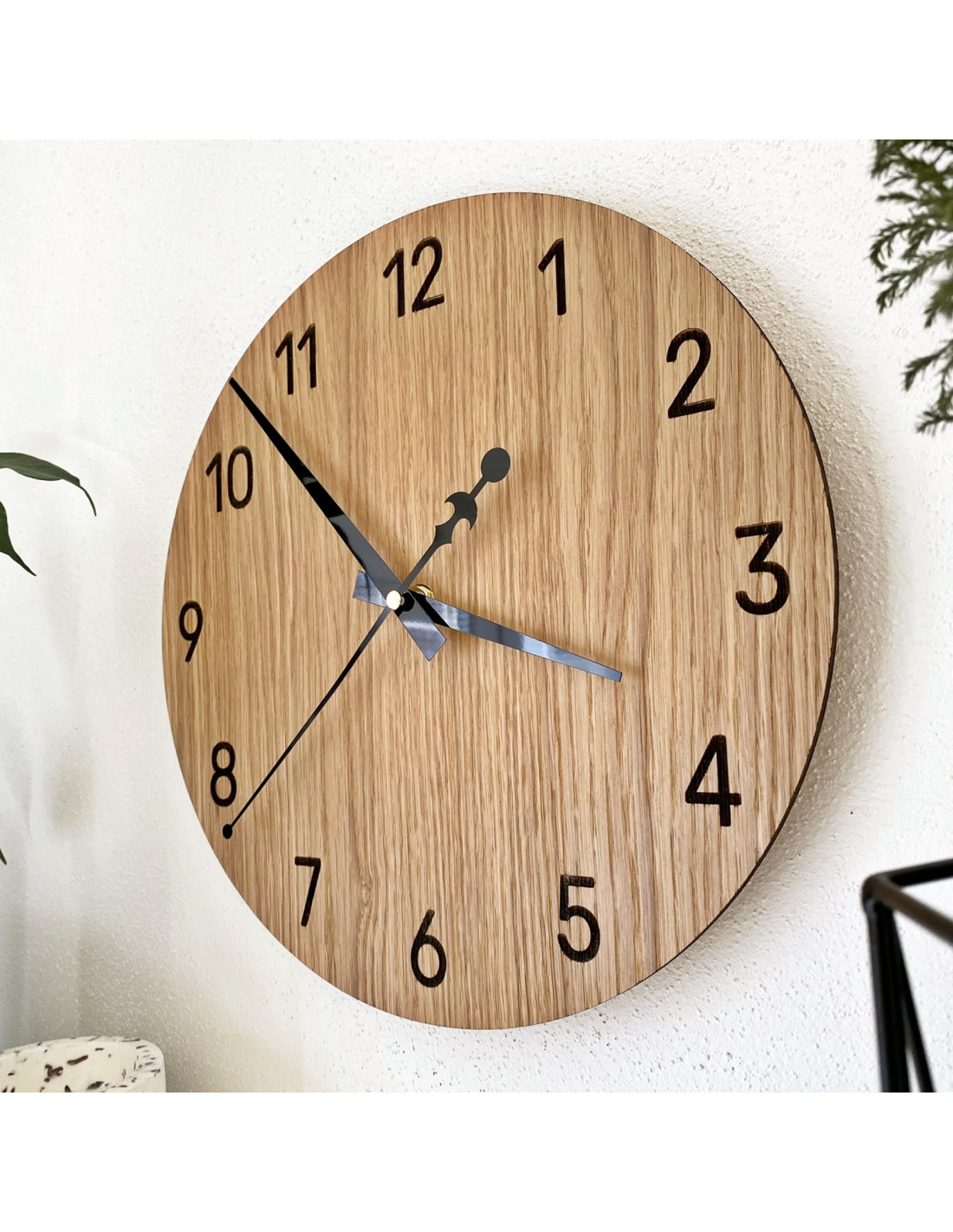 Die natürliche Schönheit des Eichenholzes in Kombination mit eleganten schwarzen Zeigern erzeugt einen dezenten und modernen Look. Die Uhr fügt sich perfekt in rustikale wie minimalistische Interieurs ein und verleiht dem Raum eine harmonische Optik.
