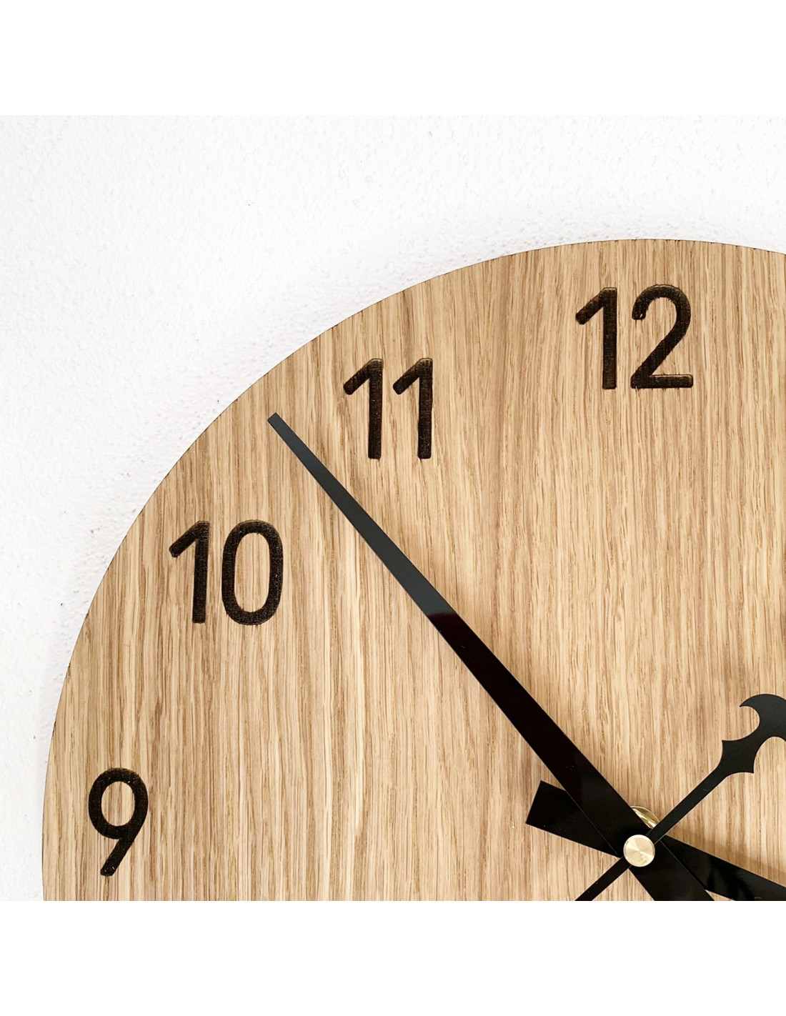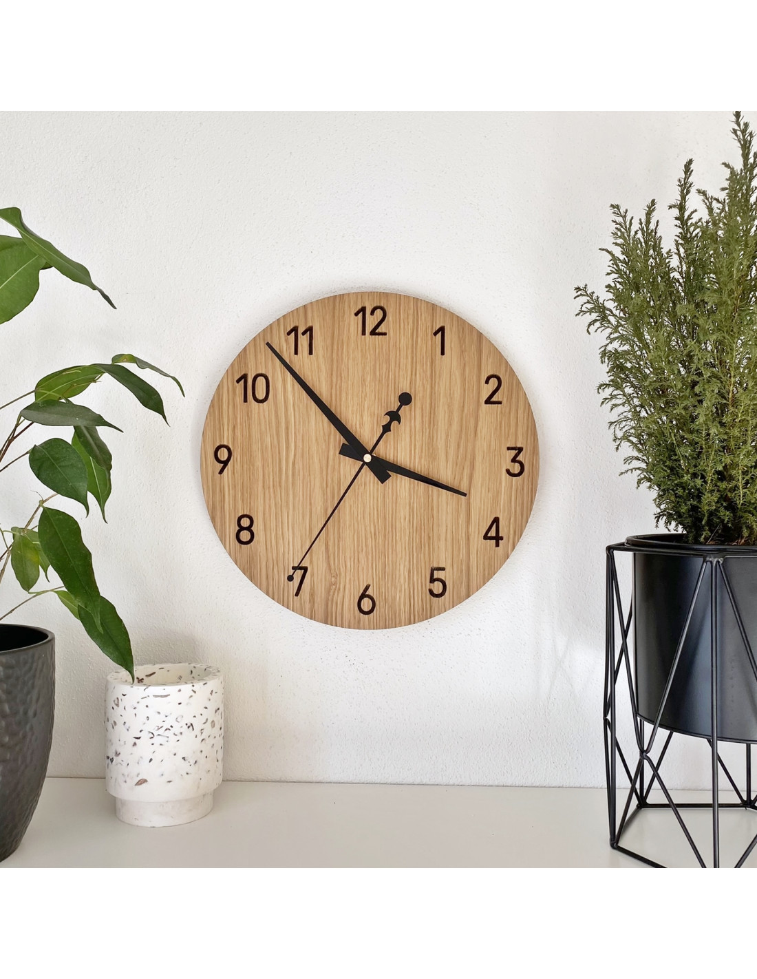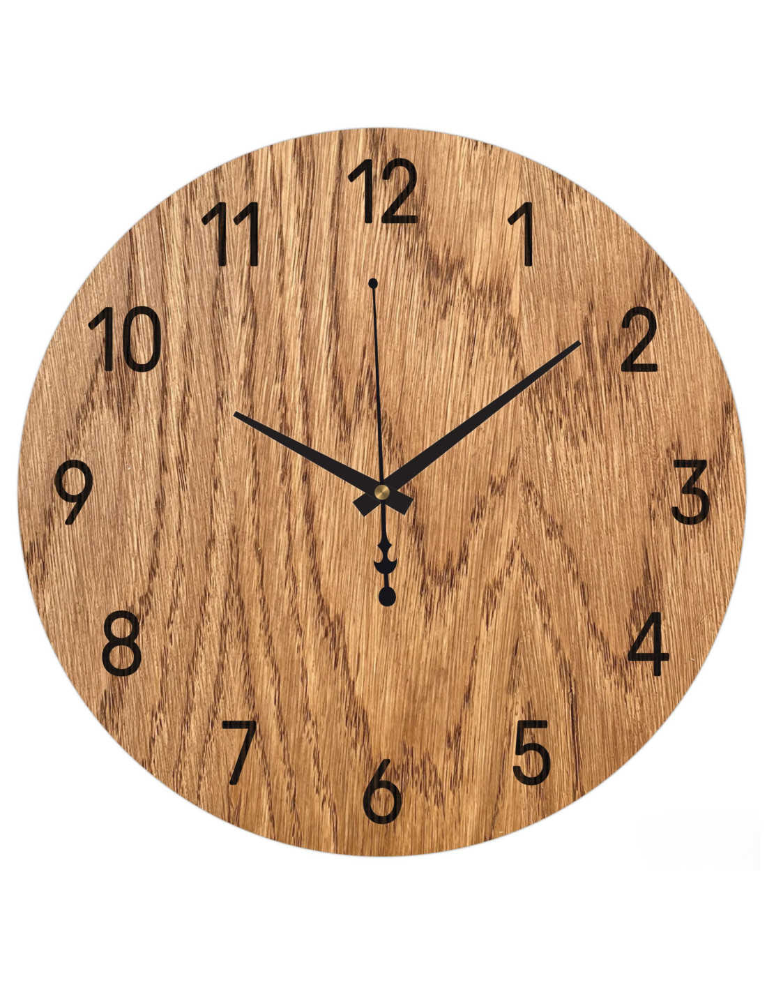 Die natürliche Schönheit des Eichenholzes in Kombination mit eleganten schwarzen Zeigern erzeugt einen dezenten und modernen Look. Die Uhr fügt sich perfekt in rustikale wie minimalistische Interieurs ein und verleiht dem Raum eine harmonische Optik.