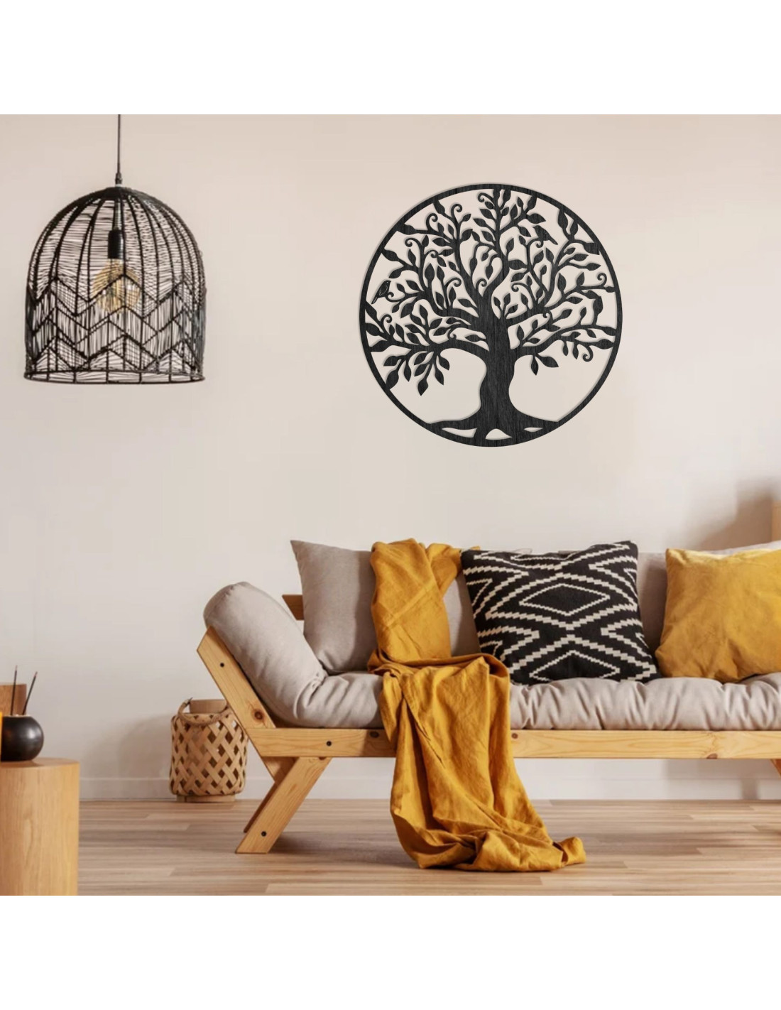 Dieser hölzerne Lebensbaum wird präzise lasergeschnitten, um feine Details zu erzielen, und anschließend von Hand bearbeitet, um ihm ein einzigartiges Aussehen zu verleihen. Jedes Stück ist aufgrund der natürlichen Maserung und des Farbtons des Holzes ein Original.