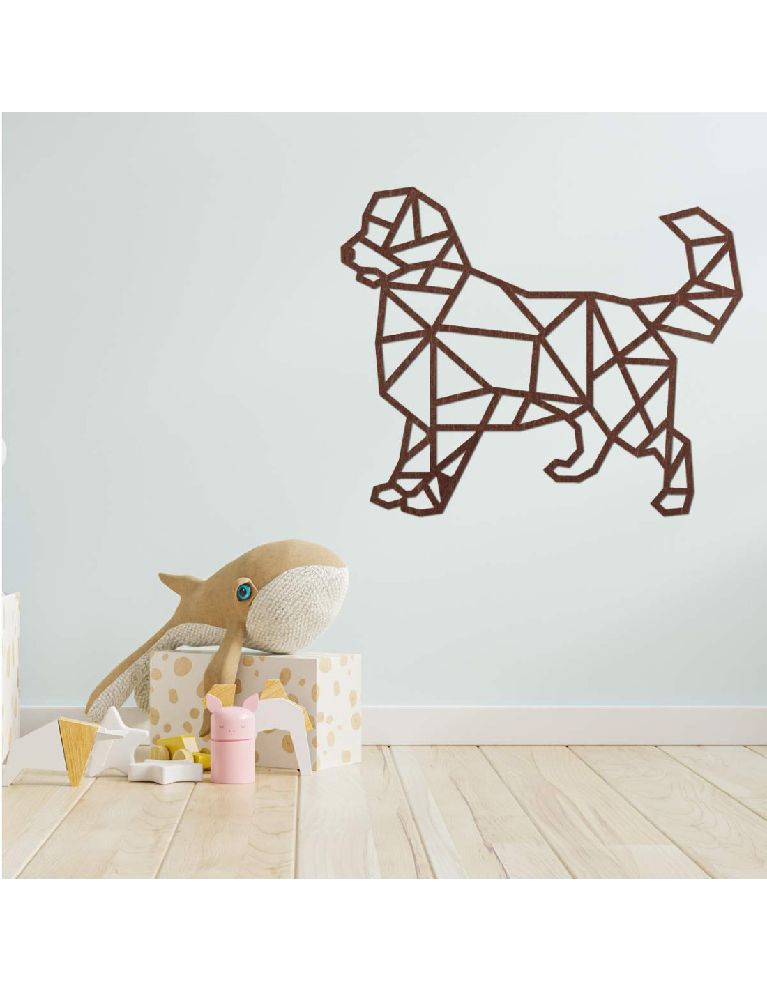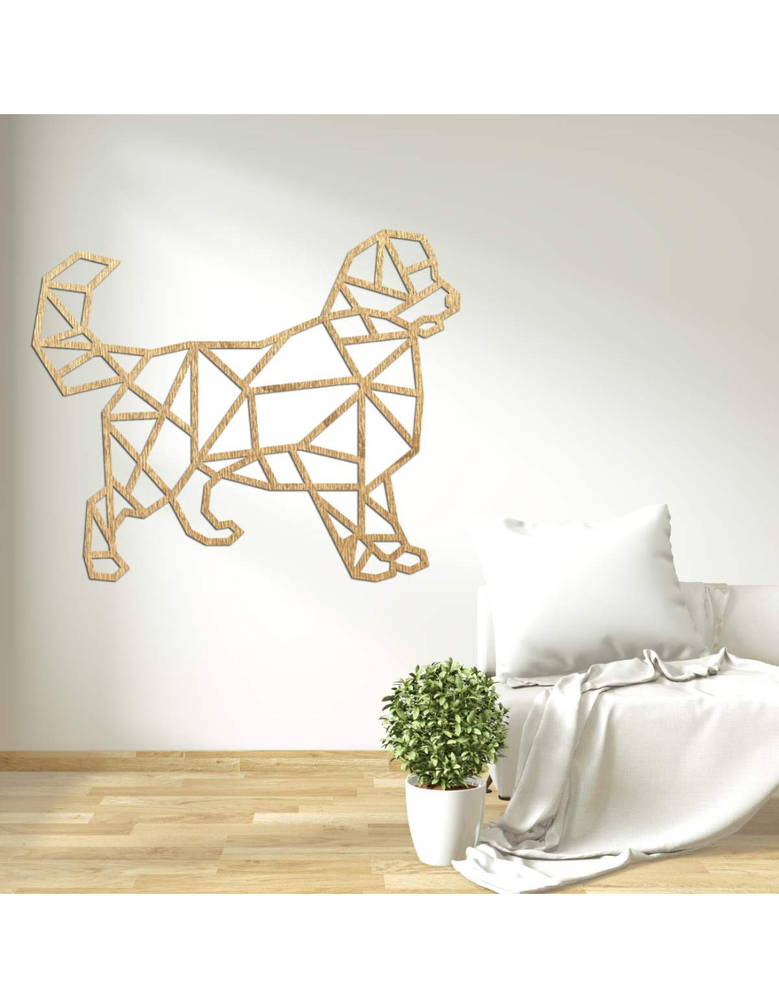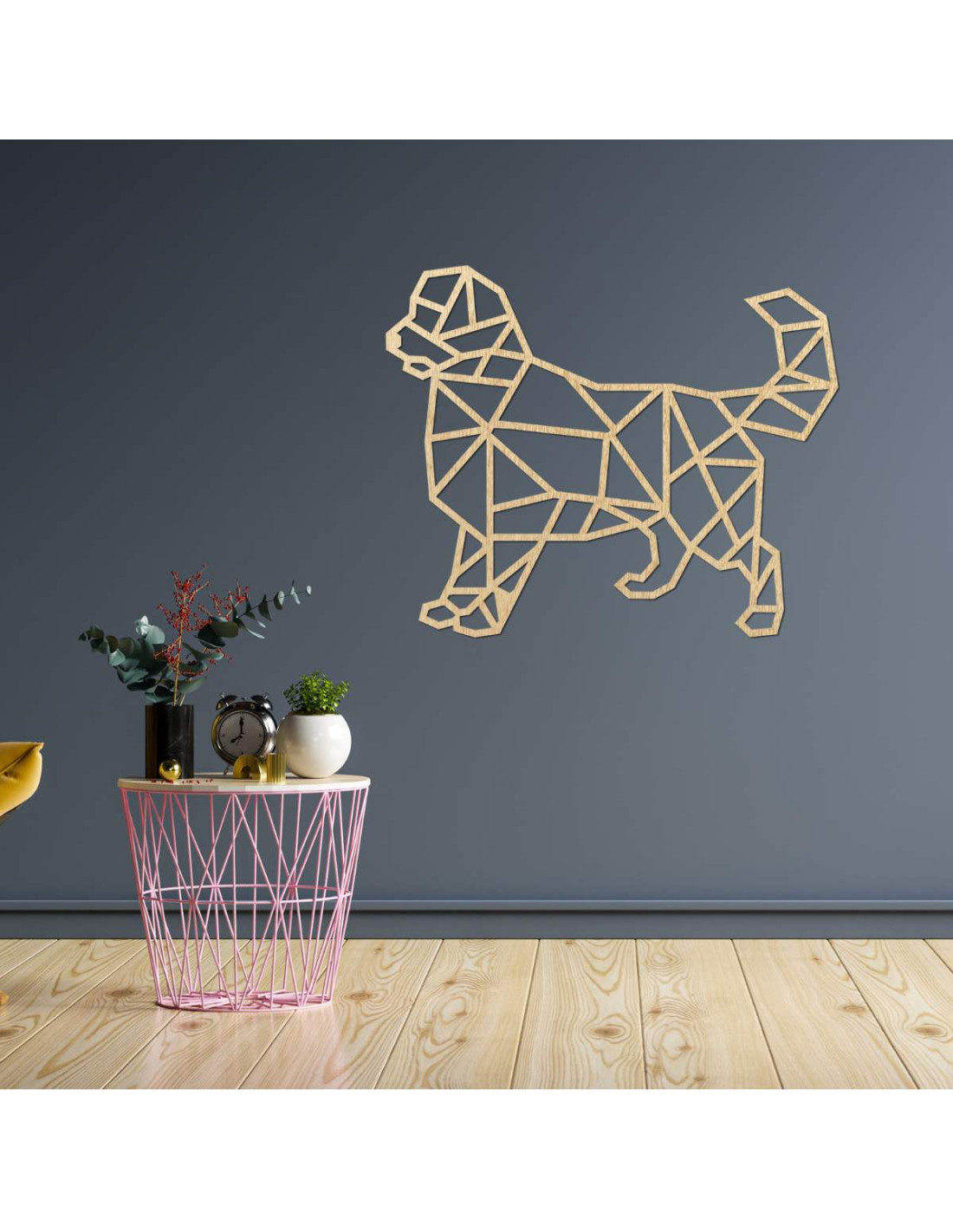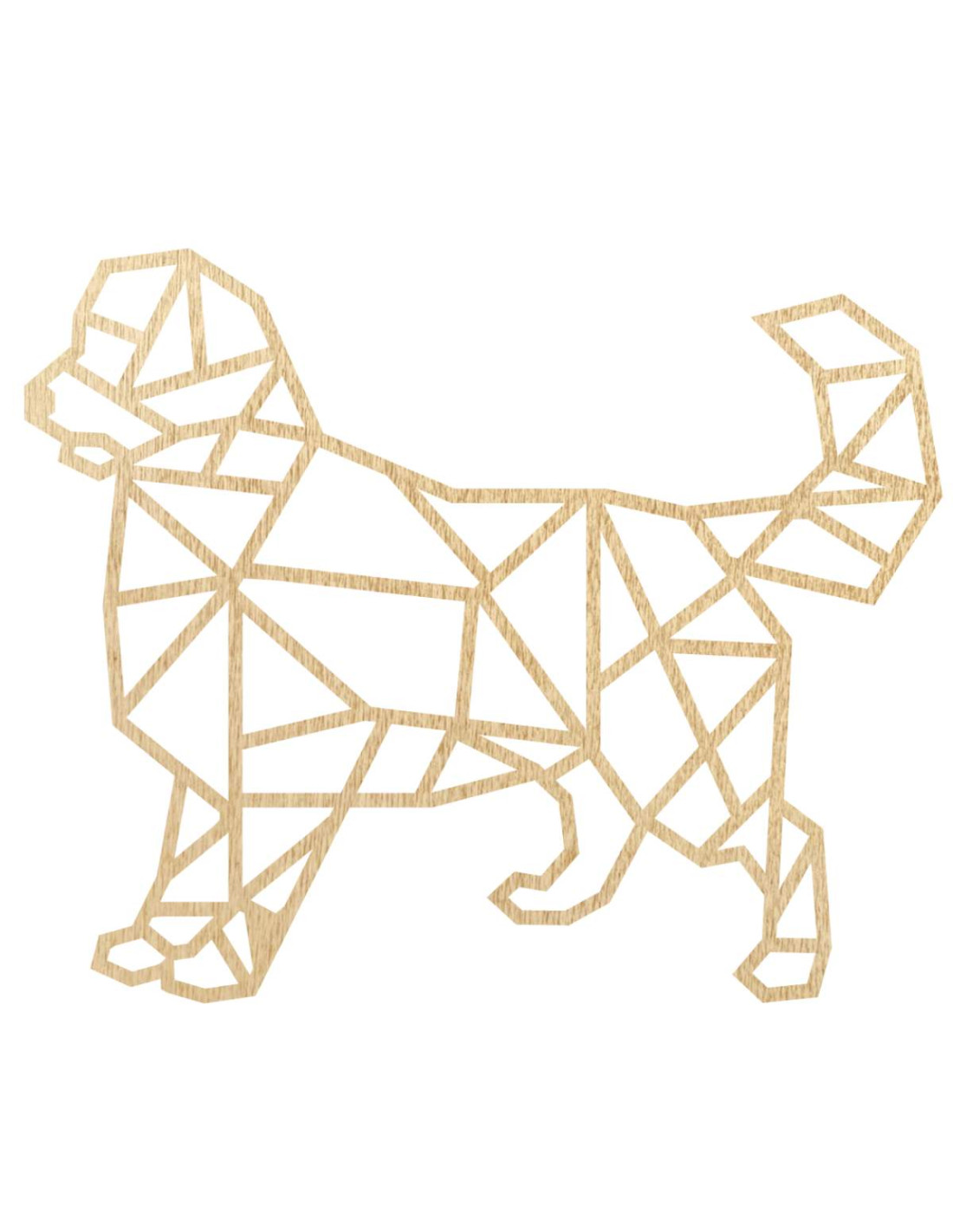 Peppen Sie Ihr Interieur mit einer modernen Holzdekoration mit Hundemotiv im geometrischen Stil auf.