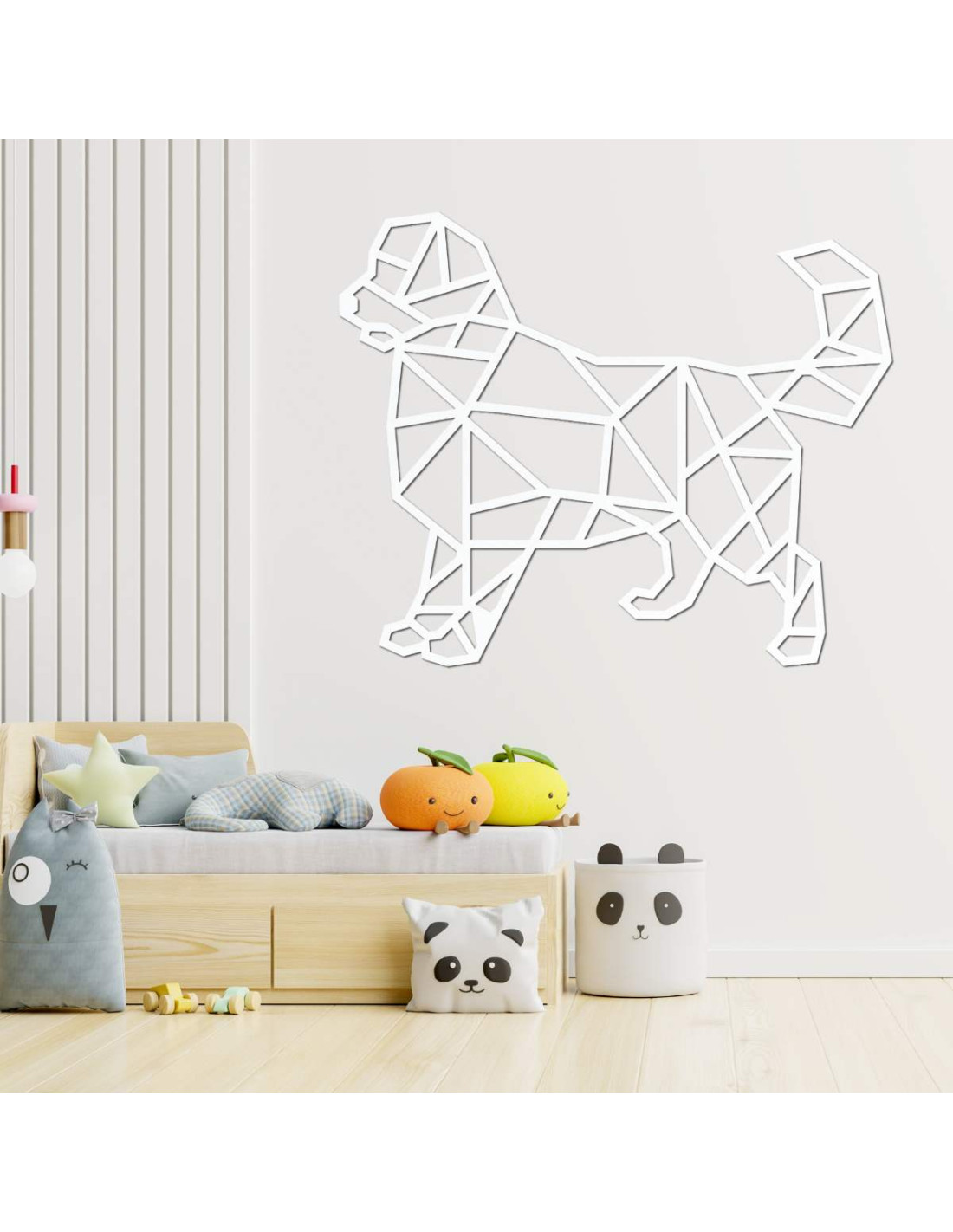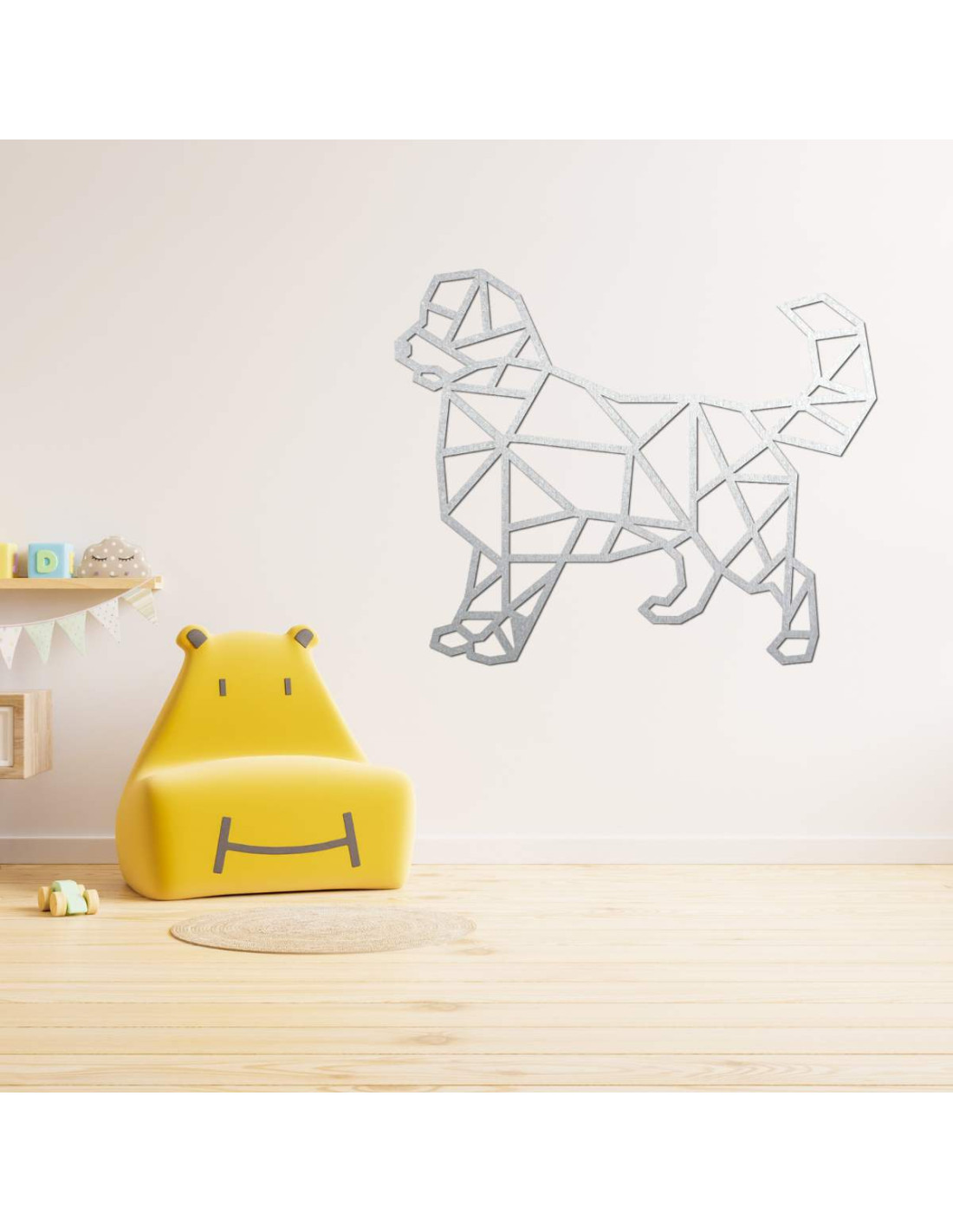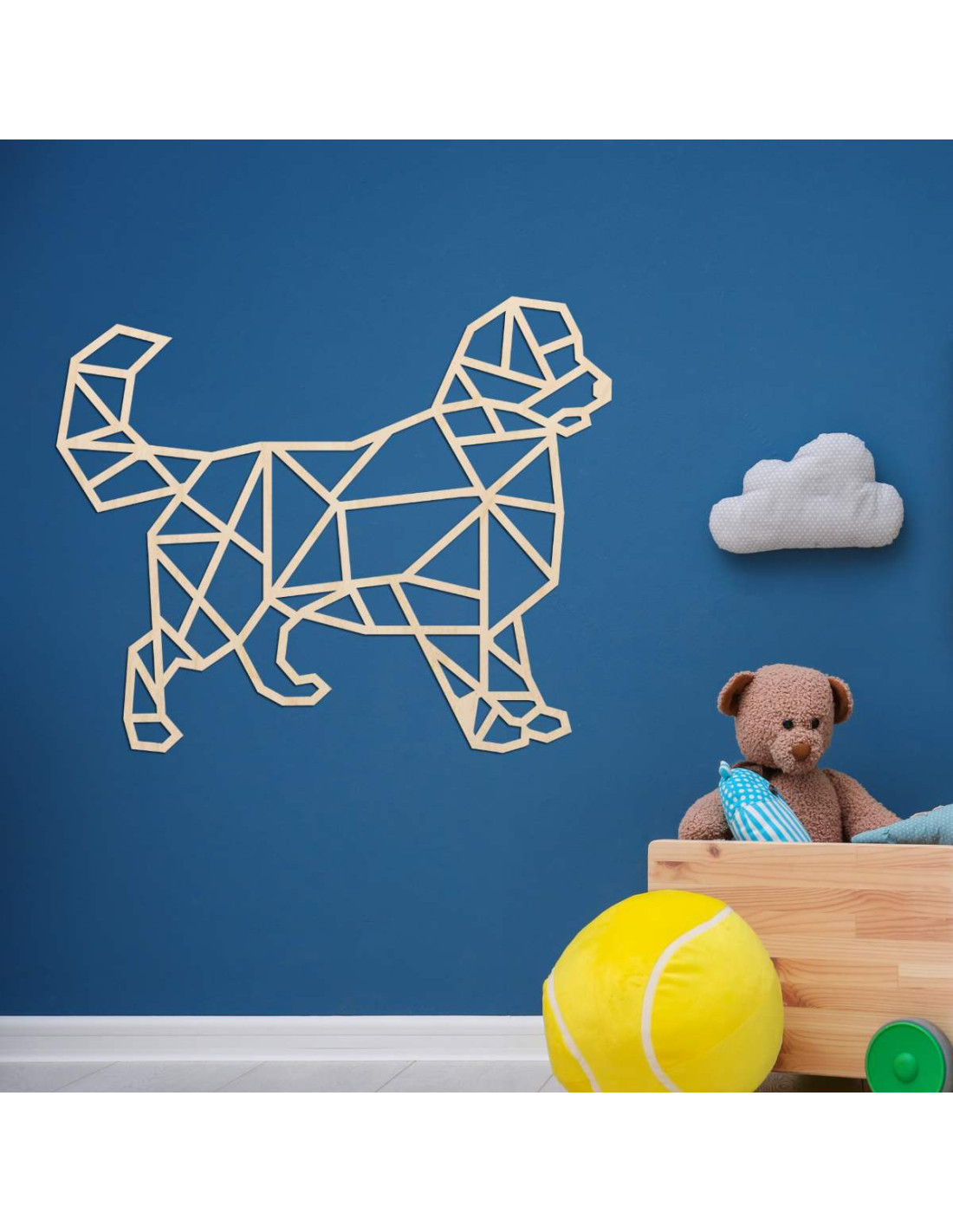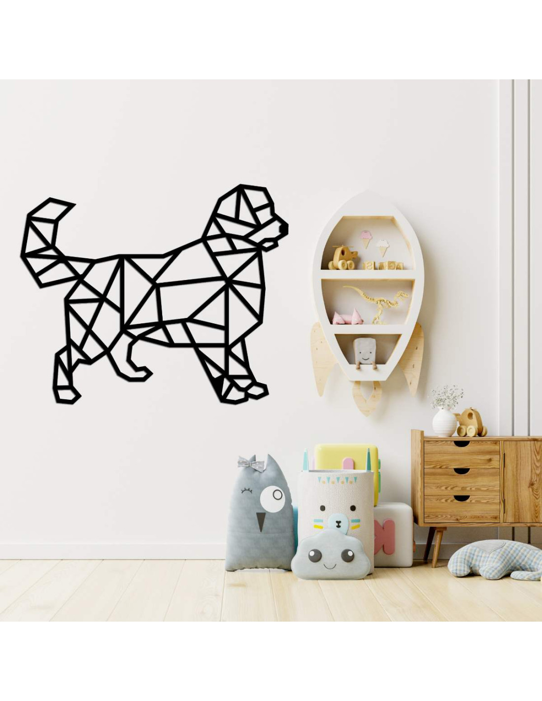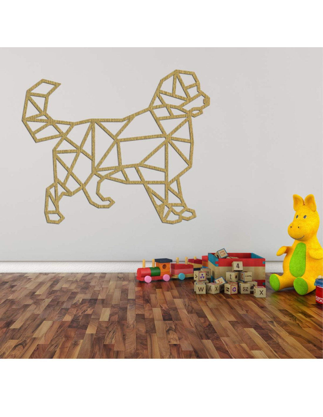 Peppen Sie Ihr Interieur mit einer modernen Holzdekoration mit Hundemotiv im geometrischen Stil auf.