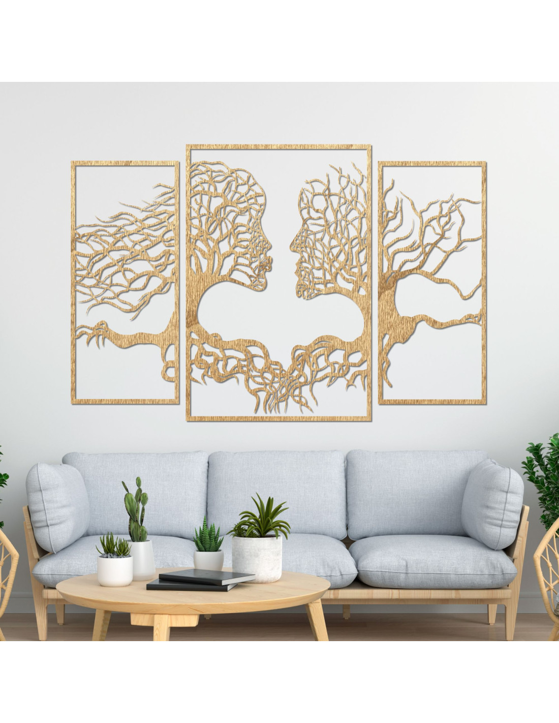 SentopAbstrakte Kunst mit ineinander verschlungenen Gesichtern aus Ästen , die Verbundenheit und Einheit symbolisieren. Ein dreiteiliges Design mit starkem Kontrast auf weißem Hintergrund, das Wachstum und Vernetzung thematisiert. Ideal als Wanddekoration , die jeden Raum belebt und ihm eine künstlerische Note verleiht.