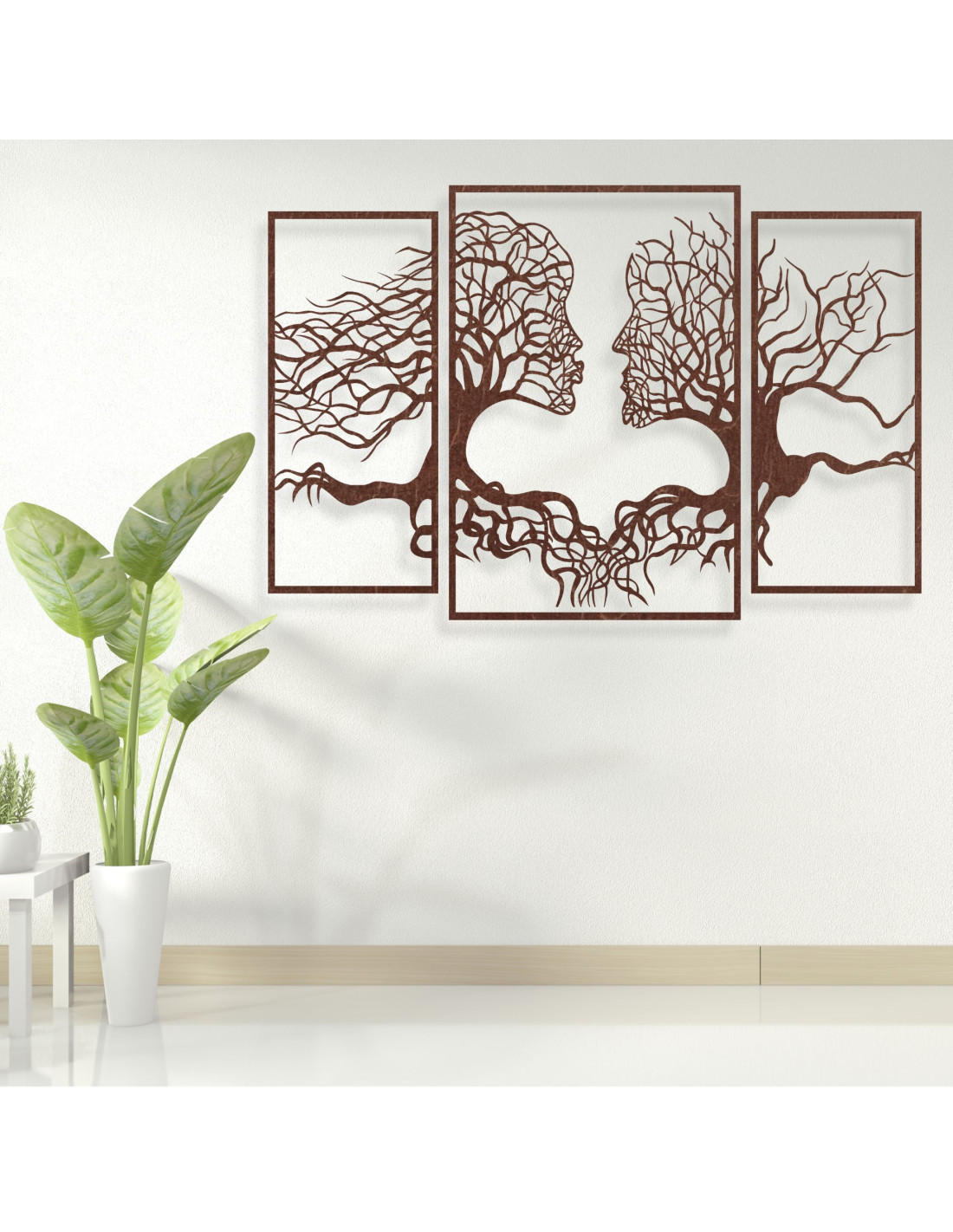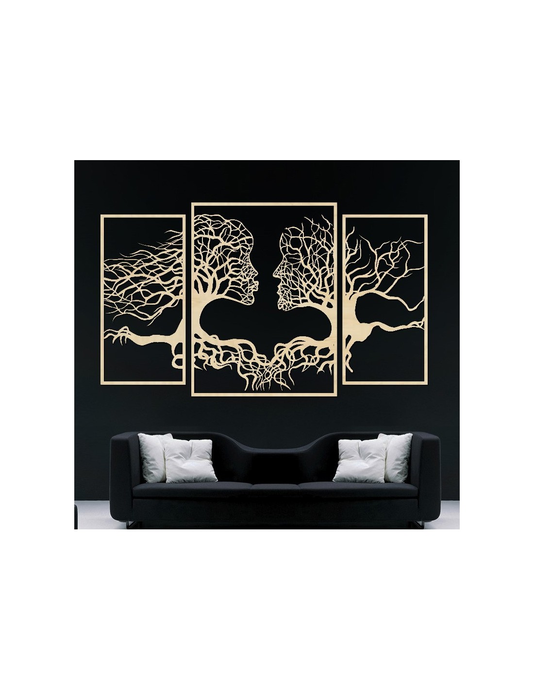 Es zeigt ineinander verschlungene Gesichter aus Ästen und symbolisiert die Verbundenheit und Einheit der Menschen. Durch den starken Kontrast zum weißen Hintergrund wird es zu einem echten Blickfang in Ihrem Zuhause. Sein einzigartiges Design eignet sich ideal zur Verschönerung von Wohnzimmer, Büro oder Atelier und zieht garantiert die Blicke auf sich.