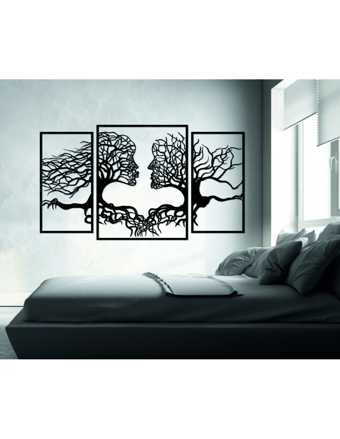 Es zeigt ineinander verschlungene Gesichter aus Ästen und symbolisiert die Verbundenheit und Einheit der Menschen. Durch den starken Kontrast zum weißen Hintergrund wird es zu einem echten Blickfang in Ihrem Zuhause. Sein einzigartiges Design eignet sich ideal zur Verschönerung von Wohnzimmer, Büro oder Atelier und zieht garantiert die Blicke auf sich.