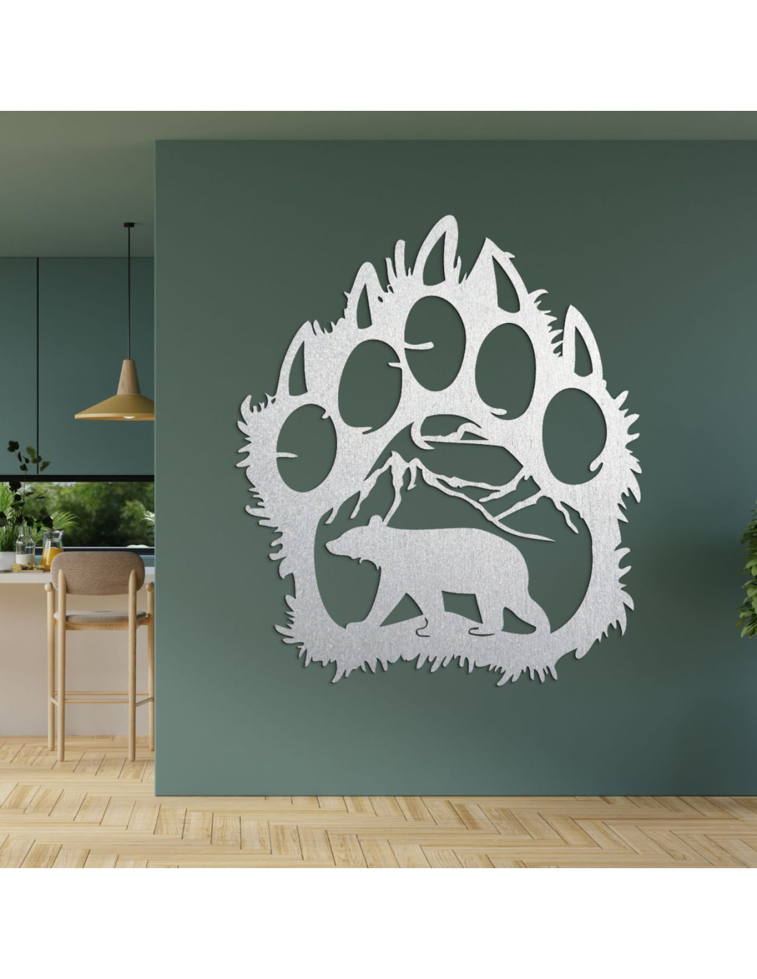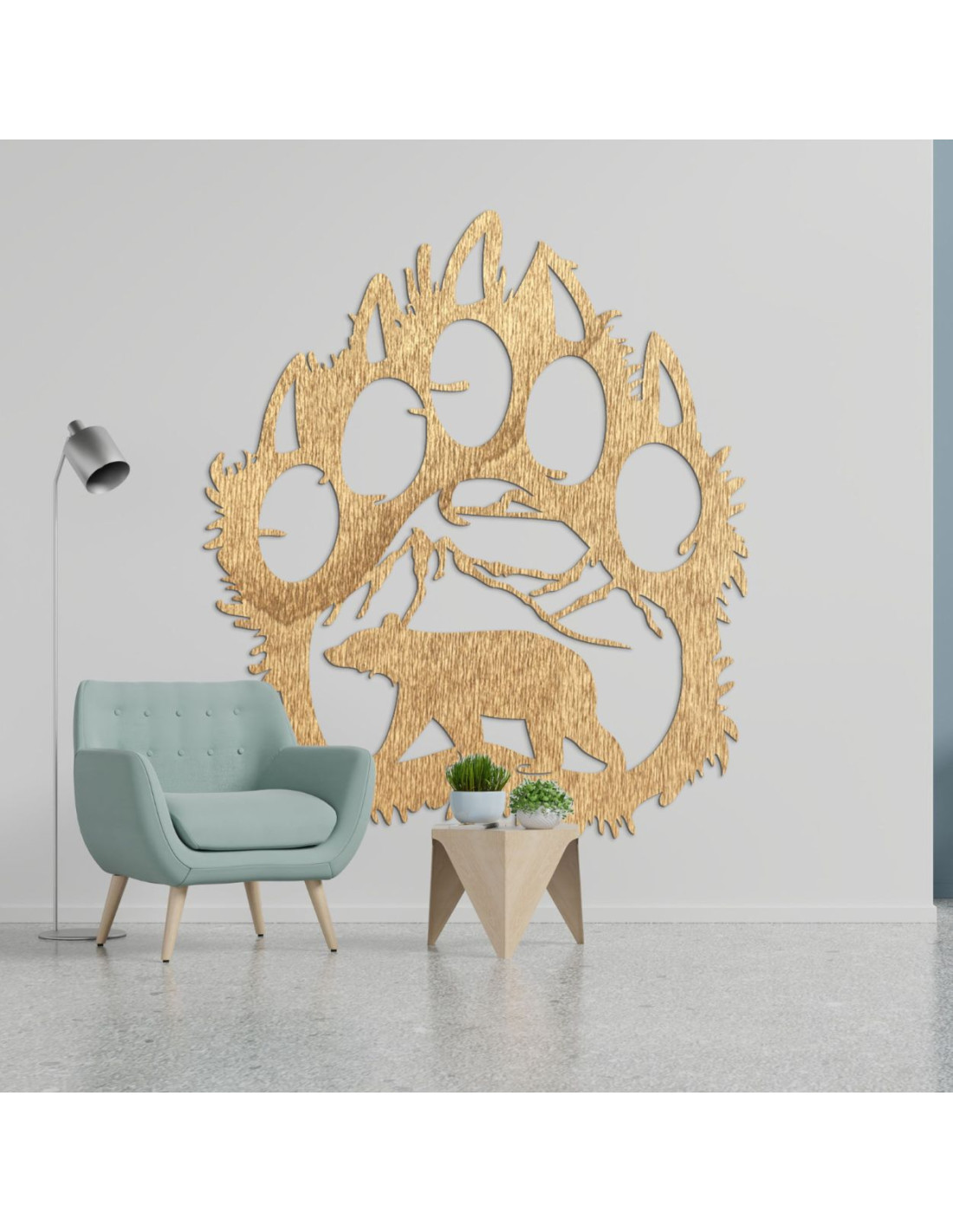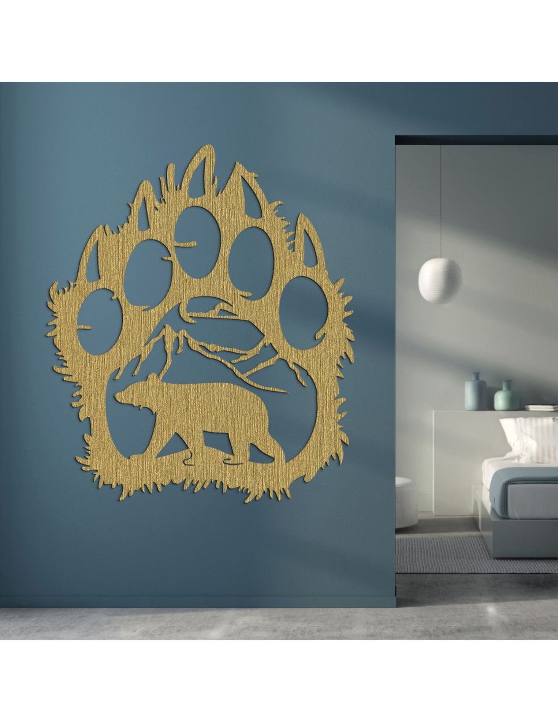 Goldene Holzsilhouette einer großen Bärentatze mit einem inneren Naturmotiv: Berge, Bäume und der Bär selbst.