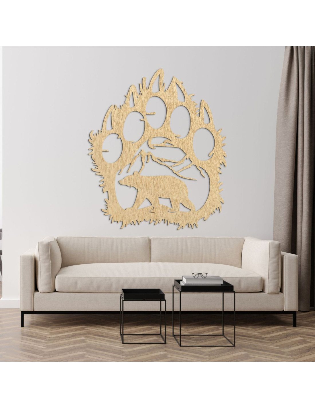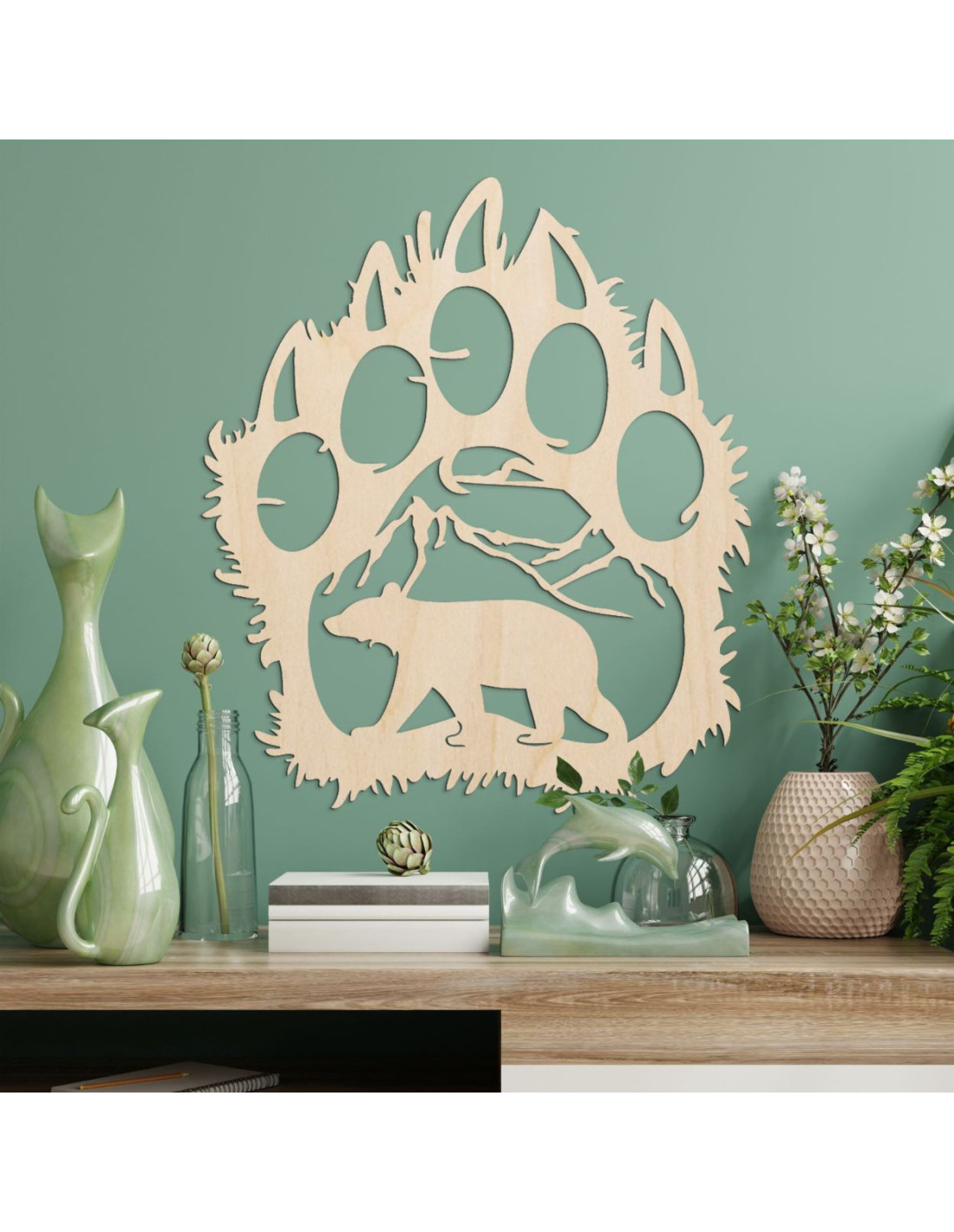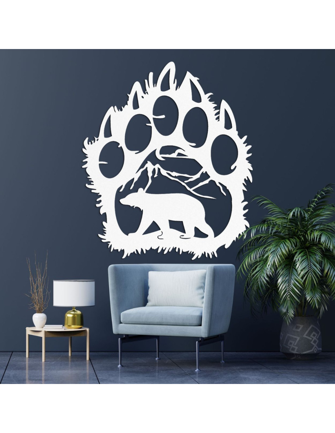 Goldene Holzsilhouette einer großen Bärentatze mit einem inneren Naturmotiv: Berge, Bäume und der Bär selbst.