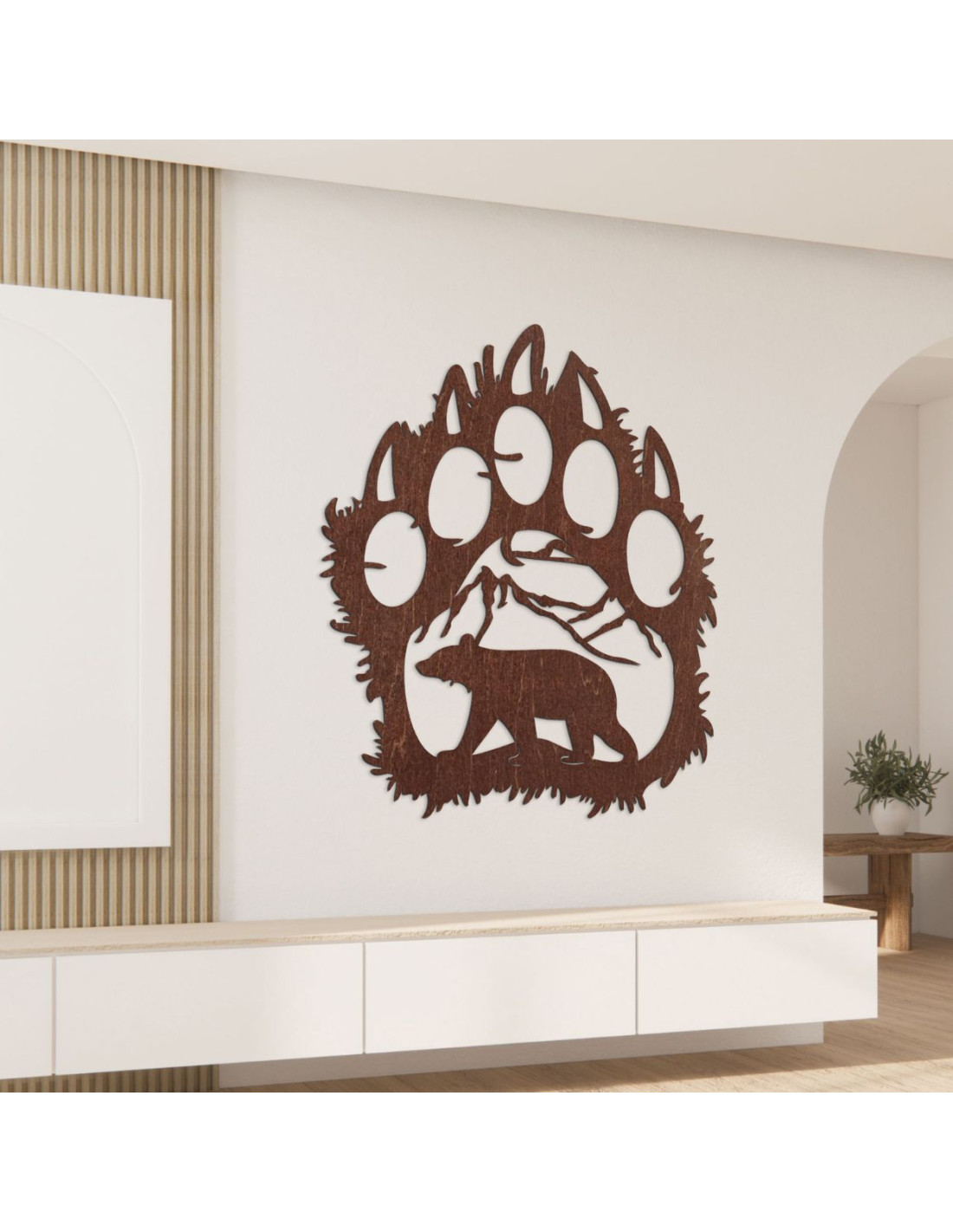 Braune, künstlerische Holzschnitzerei, die einen symbolischen Bärenfußabdruck mit einer Wildtierszene im Inneren darstellt.