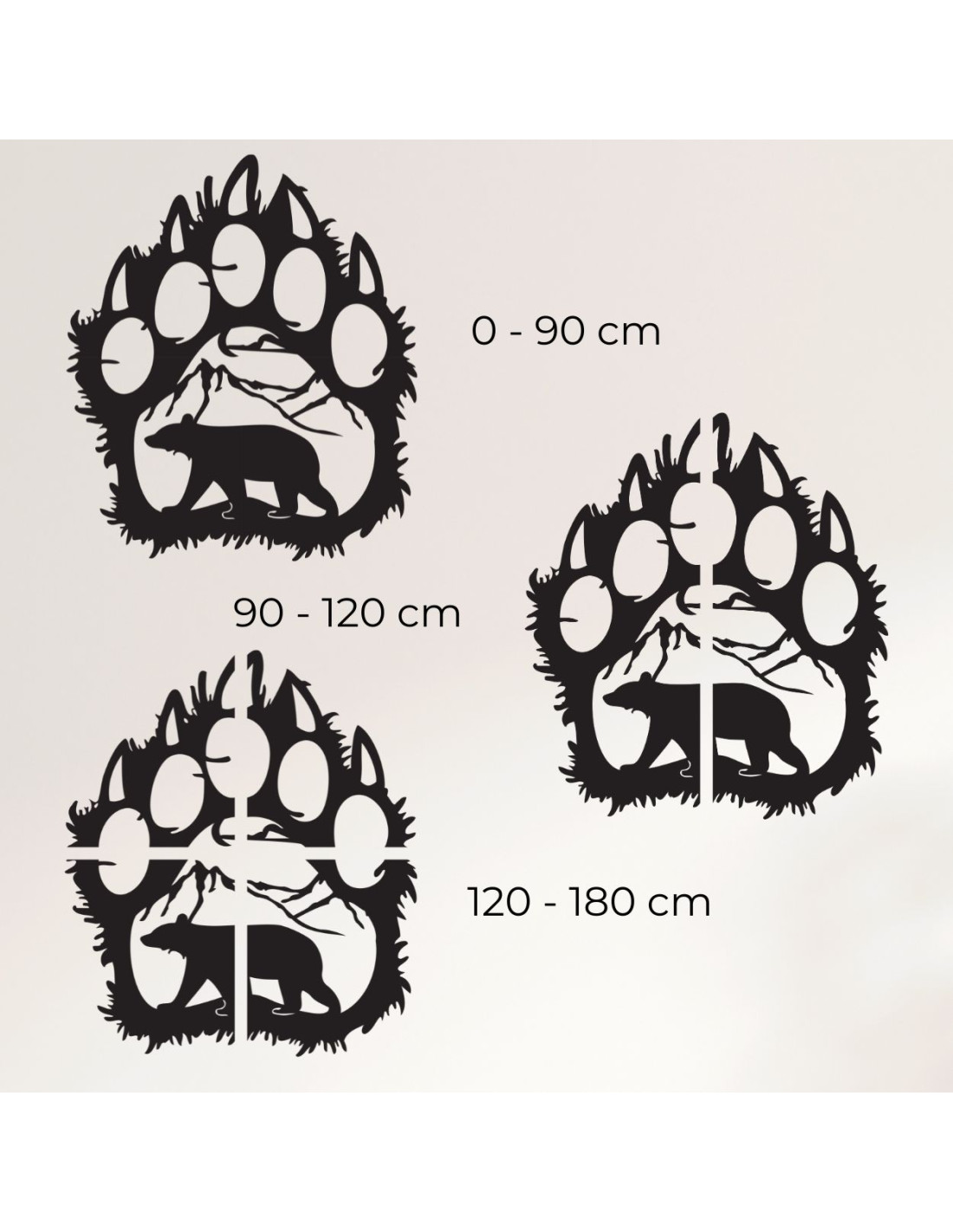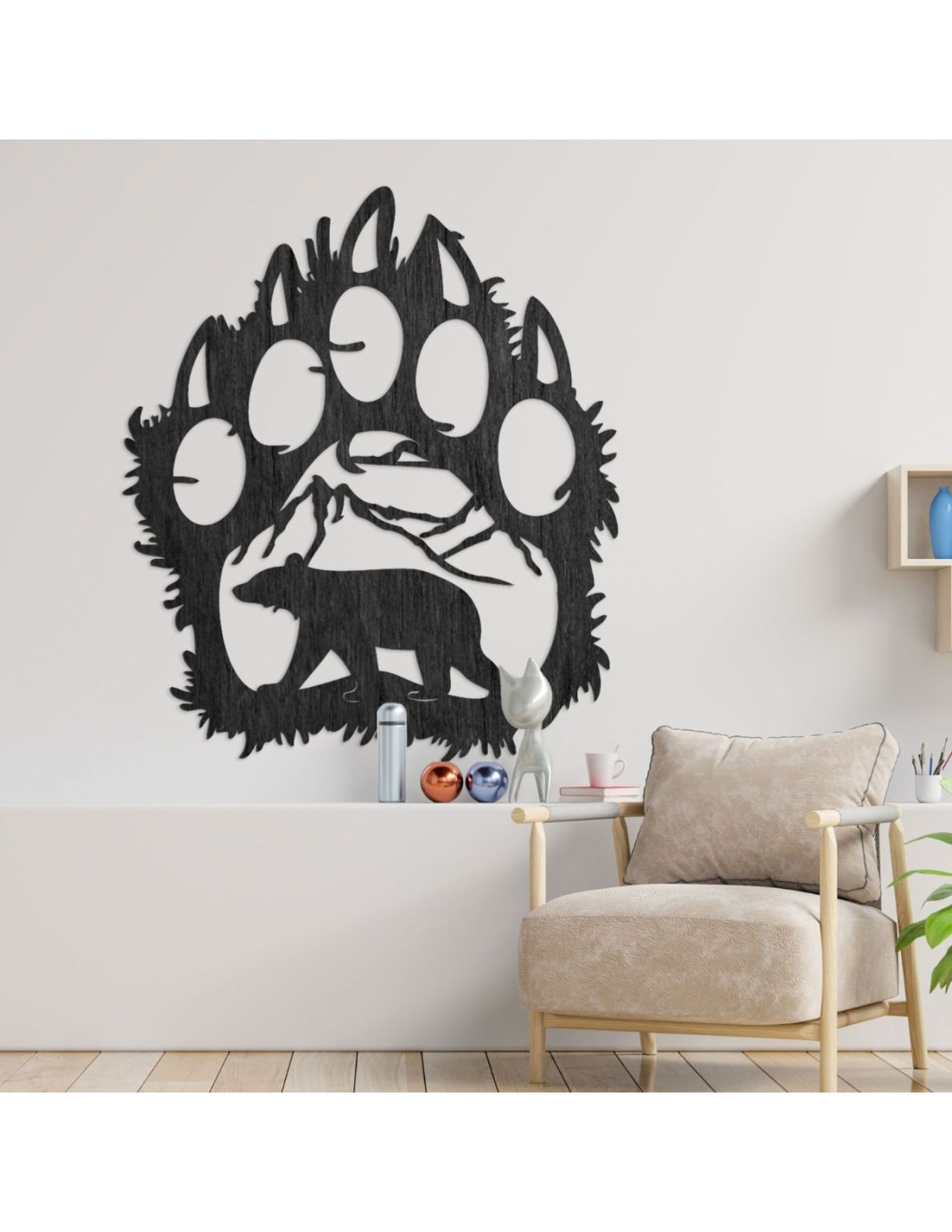 Schwarzes dekoratives Bärenfußabdruckmotiv mit geschnitztem Bären und Bergumgebung – beeindruckender Formenkontrast.
