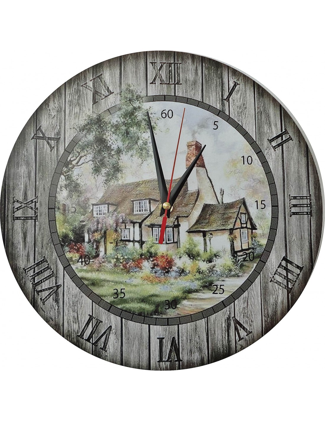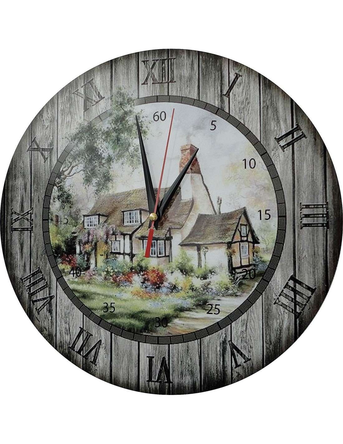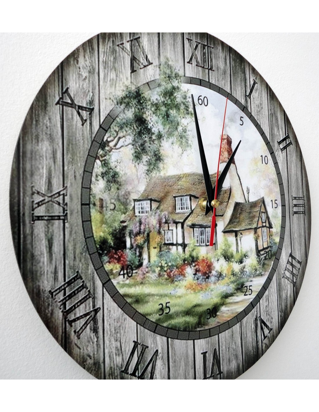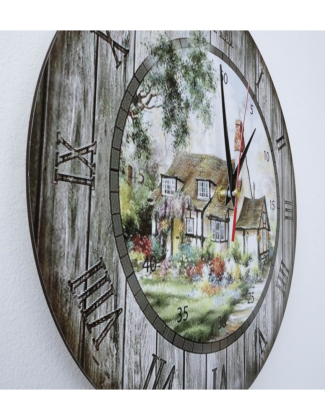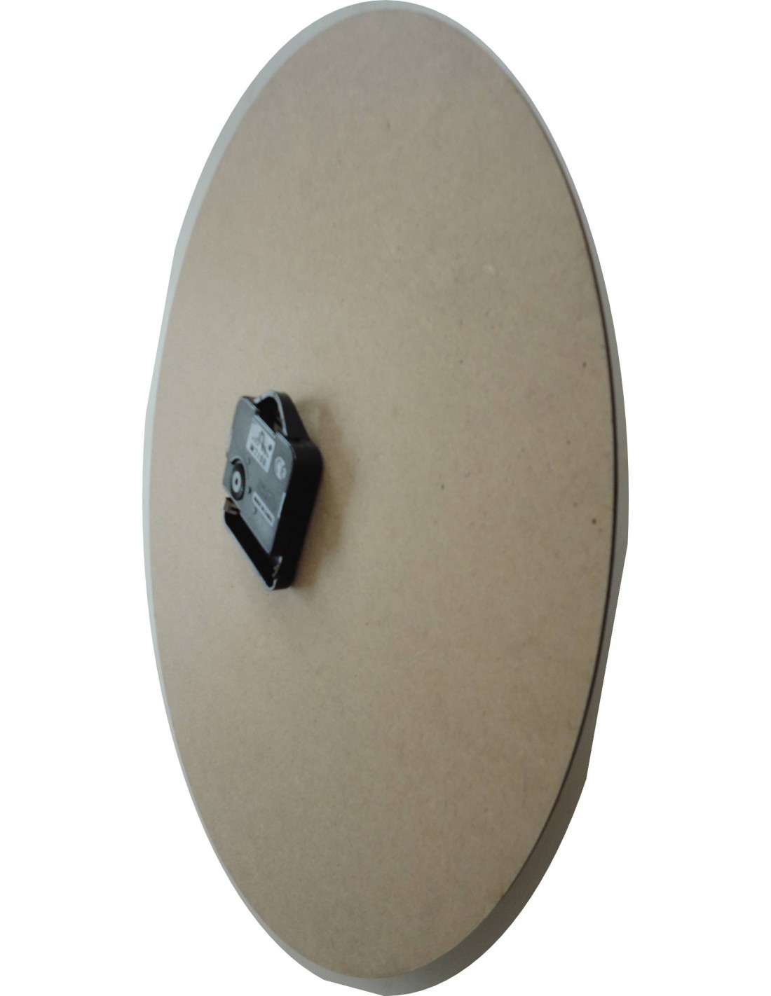 Wir fertigen die Uhr aus einer HDF-Platte, auf die ein Aufkleber mit einem Motiv geklebt ist.